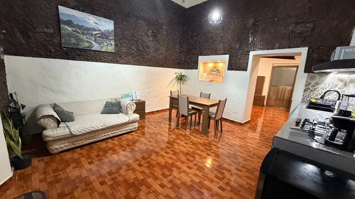 Bu sessiz ve merkezi konaklama yerinin sıcaklığının tadını çıkarın. Çift kişilik yataklı bir yatak odamız, klima ve TV, donanımlı mutfaklı (buzdolabı ve ocak) bir oturma odamız ve orta boy bir araba için park yerimiz var. Merkezdeki turistik yerlere 5 dakika yürüme mesafesindeyiz. (Paseo Colón, Paseo del Rio, Alameda, Teleferik) Orizaba'nın en sakin ve güvenli bölgelerinden birinde konaklayın, burada teleferiğin güzel manzarasıyla keyifli bir öğleden sonra geçireceksiniz.