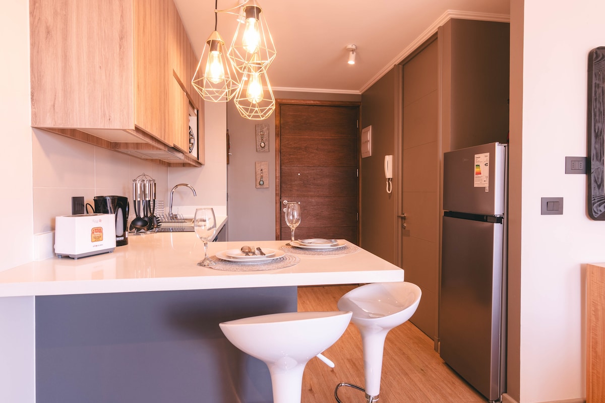 Pucón'un en iyi konumunda, Playa Grande'ye ve merkeze yürüme mesafesinde ve ana caddenin gürültüsünden izole edilmiş yeni ve samimi bir stüdyo. 2 kişilik yatak, 2 kişilik şilte, tam donanımlı mutfak, tam donanımlı banyo, WiFi, Netflix, Disney+ ve daha fazlasıyla 49" TV, teras, ısıtma, ızgara, kahve makineleri, sınırsız kullanım için 2 bisiklet ve daha fazlasına sahiptir. Bina girişinin önünde halka açık otopark mevcuttur. Her konaklama için yatak takımı, havlu, temel banyo ve mutfak malzemeleri dahildir.
