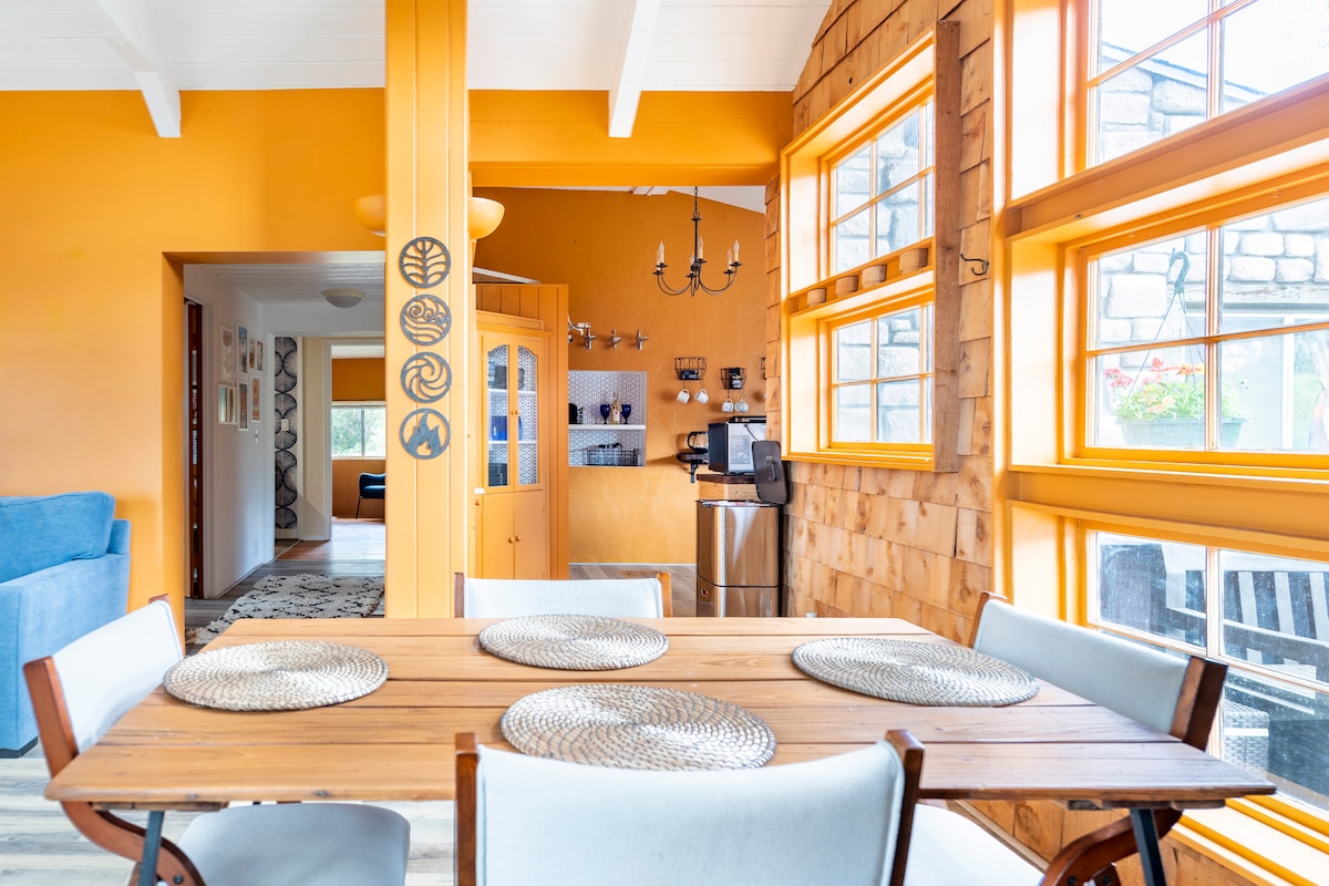 Kumtaşı manzarası, özel jakuzili açık alan, sıcak havalarda serin tutulabilir, tercihinizi mesaj atın. Ebeveyn banyolu yatak odaları mahremiyet için evin zıt taraflarında yer almaktadır. Şehir merkezine bisikletle 7-10 dakika, üç üzüm bağına 5-10 dakika yürüme mesafesindedir. Meyve bahçesi 900 ft²'lik yatak odalarını çevreler ve oturma odasında akıllı TV'ler vardır, mutfak iyi donanımlıdır. Çitle çevrili bahçede barbekü yapmak ve gün batımının tadını çıkarmak için gölgeli açık alanlar vardır. 4 misafir için en iyisi, 5. misafir için katlanır yatak.