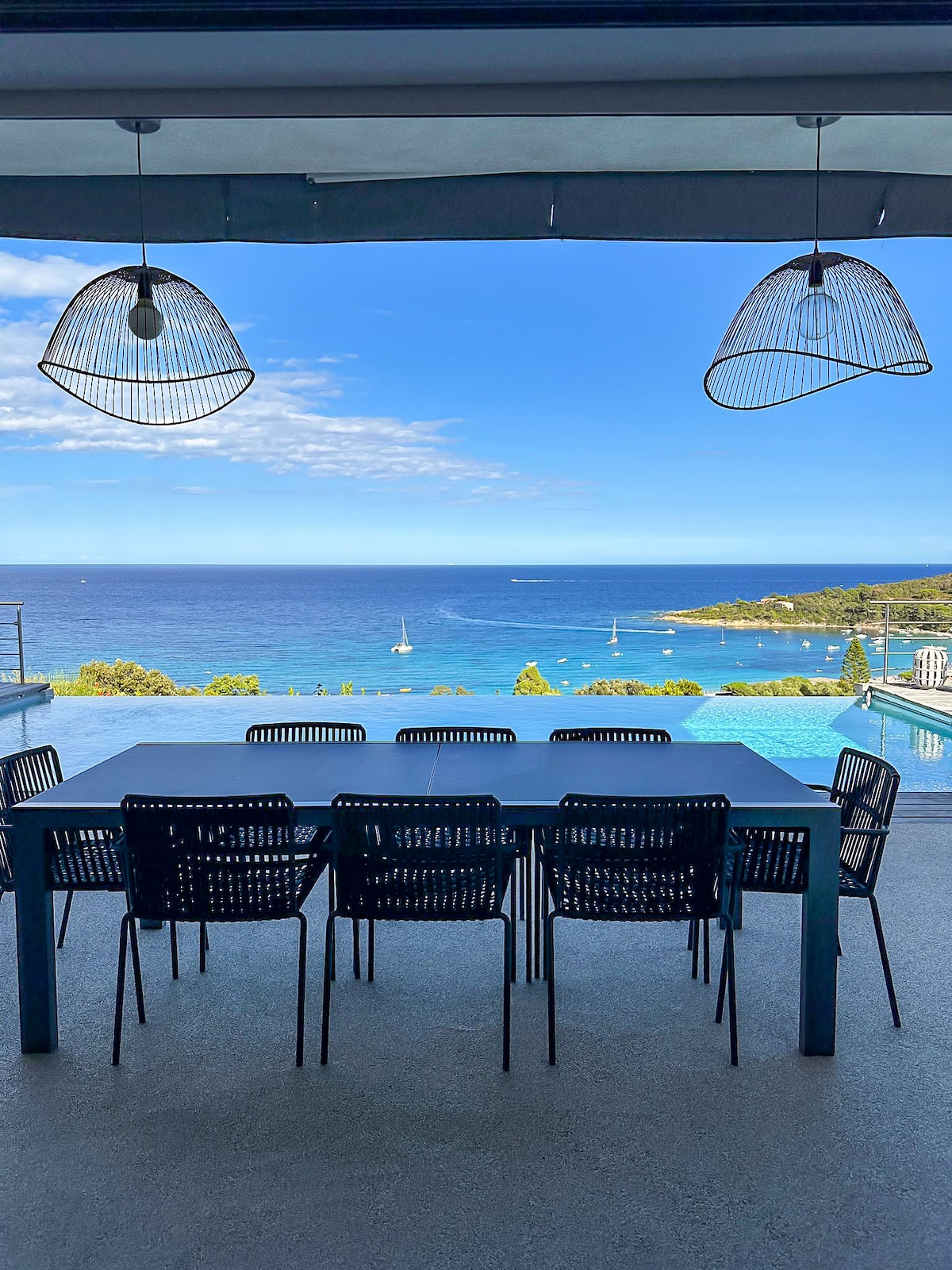 Minivilla mitoyenne les pieds dans l eau 85 m2 piscine chauffée uniquement sur demande Jacuzzi accès crique privée climatisée 6 pers Vue mer imprenable À 1 km centre ville parking privé 800m supermarché tabac presse Jardin privatif Terrasse/salon de jardin, plancha, transat espace bureau Cuisine équipée salon 2SDB buanderie 3 chb Lave linge lave vaisselle Télévision, wifi terrain clos 4000m2 Boulodrome Espace détente/repas /Jeux Linge de lit, draps de douche, serviette piscine