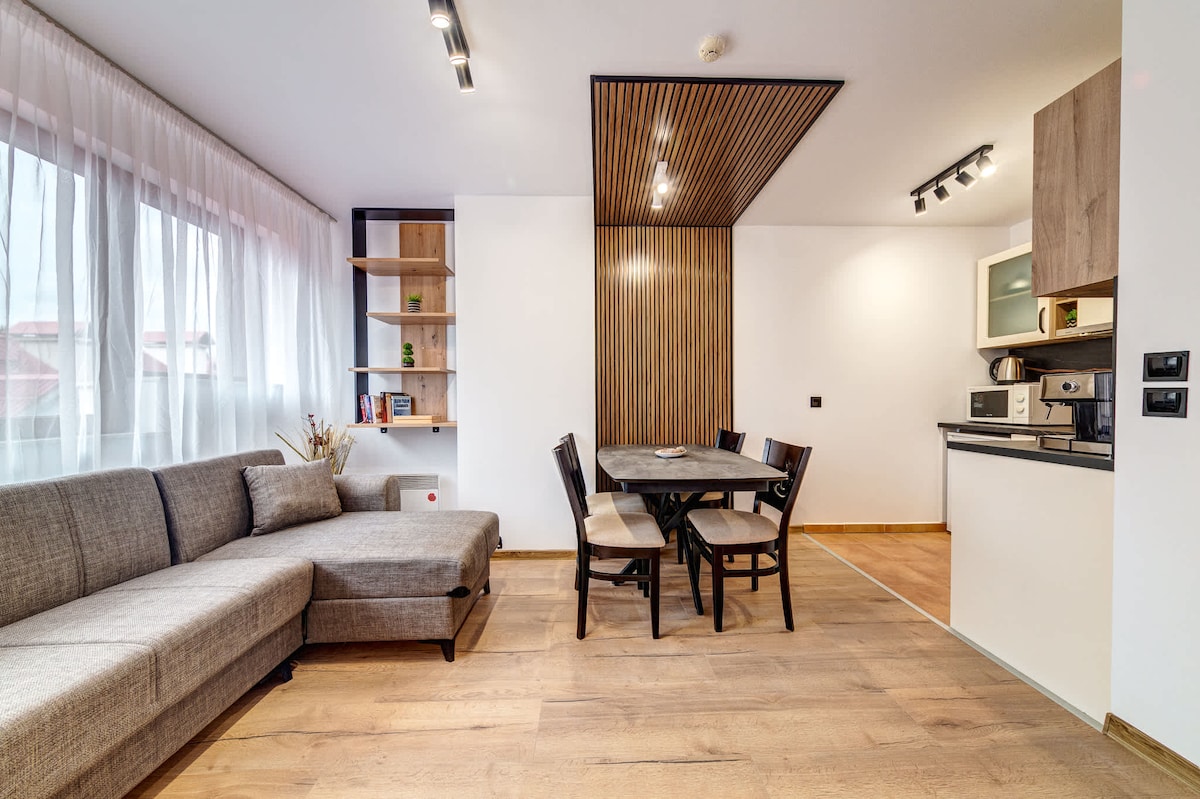 Грижливо, практично и дизайнерски обзаведено, студиото разполага с всичко необходимо за пълноценна почивка-ергономичен антистрес матрак, ортопедични или високи възглавници, леки завивки, романтична камина, съвременни уреди, напълно обзаведена кухня с маса за хранене, удобен диван, който се превръща в легло, просторна баня, високоскоростен Интернет и гледка към борови гори от балкона! Намира се на първи (не партерен) етаж и има собствен изход към градината! Паркингът е точно до входа на сградата.