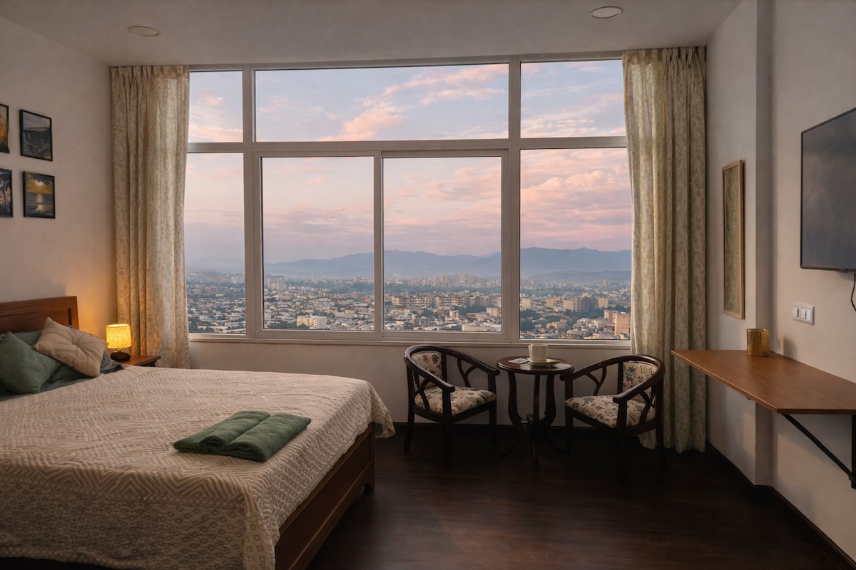 Bu aydınlık 12. kat stüdyodan altın bir gün doğumuna ve 180° ufuk ve dağ manzaralarına uyanın. Yumuşak perdeler, ahşap mobilyalar, ormandan esinlenen sanat eserleri, bitkiler ve kitaplarla tasarlanmış, size kolaylık sağlamak için kompakt bir mini mutfağı olan huzurlu bir inziva yeridir. Chandigarh Havalimanı'na sadece 15 dakikalık mesafede, kafeler, restoranlar, Decathlon ve alışveriş merkezleri yürüme mesafesinde, ayrıca otoyola kolay erişim. İş veya tatil konaklamaları için rahat, şık bir üs.