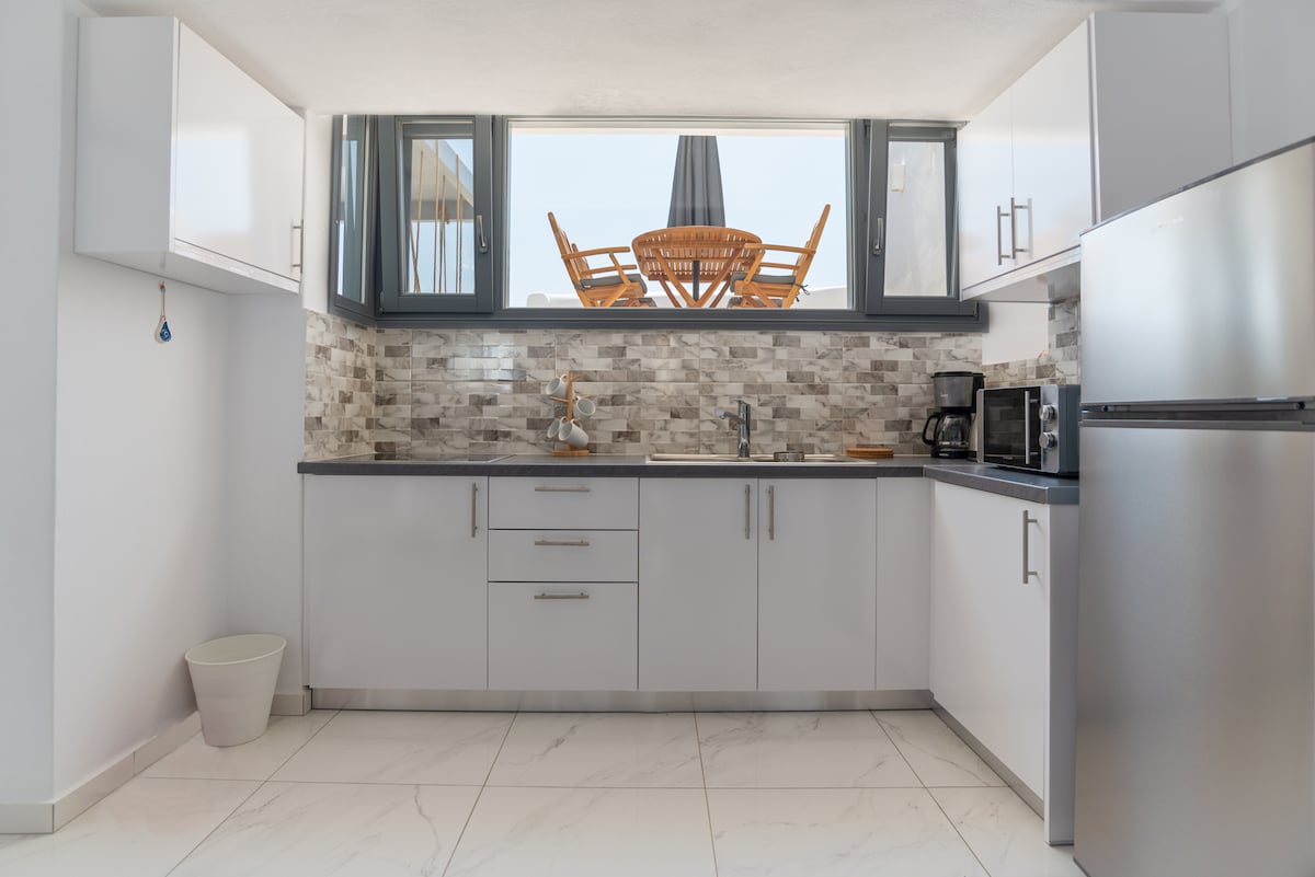 Deniz mavisi panjurları açın ve serin esintiyi içeri alın, ardından esintili bir sahil inzivasındaki kentsel beton mutfak tezgahında bir atıştırmalık hazırlayın. Engellenmemiş okyanus manzarası eşliğinde gün batımında keyifli içecekler için geniş, yapraklı verandaya çıkın! Daire, sabah yüzmesi için kumlu bir plajın yanında ve Naousa'nın merkezine ve ana meydanına 2 dakika yürüme mesafesindedir. Mağazalar, restoranlar, barlar ve kulüpler yürüme mesafesindedir, ancak bölge çok sessiz ve sakindir!