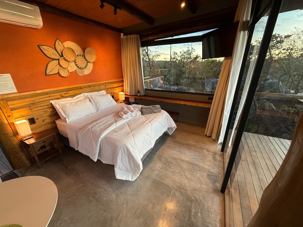 Dağ evimiz doğaya tamamen entegre edilmiştir. Büyük cam çerçeveleri ve muhteşem bir manzara sunan Cerrado ve dağların ücretsiz görünümü vardır. Tam mutfak, birinci sınıf yatak ve banyo çarşafları, harika ısıtmalı duş, dolap ve 5 yıldızlı otel yatağı ile yatak. Misafirlerin Chapada'nın doğası ve yıldızlı gökyüzünü düşünebilmeleri için dağ evinin tamamı boyunca verandalı bir balkon vardır, böylece misafirler Chapada'nın doğası ve yıldızlı gökyüzünü düşünebilir. =)