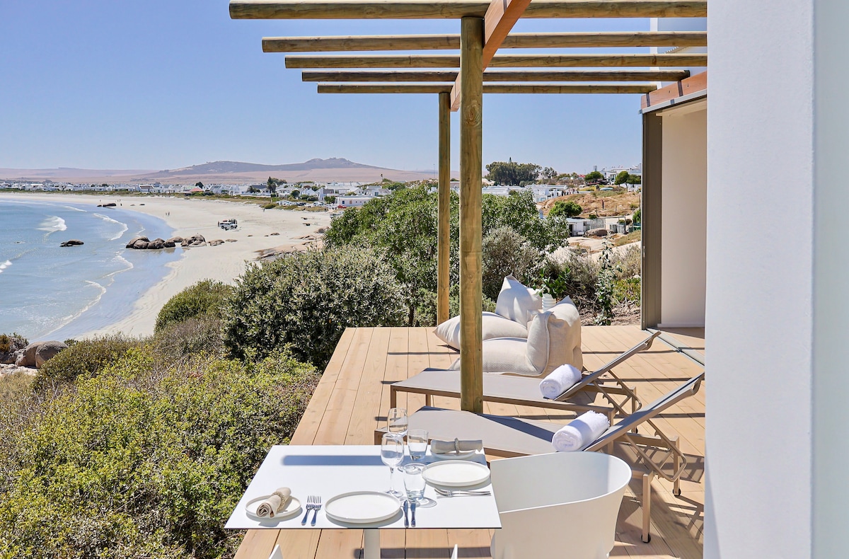 Our beach house is situated on one of the most spectacular beachfront positions in Paternoster. Experience an authentic coastal lifestyle with large doors opening onto the patio which offers majestic 270 degree views of the Atlantic Ocean and the Paternoster Bay. The house has all the comforts couples would need including a fully equipped kitchen. For the cold winter evenings, enjoy our cosy fireplace or indulge in a private jacuzzi with breathtaking sea views.
