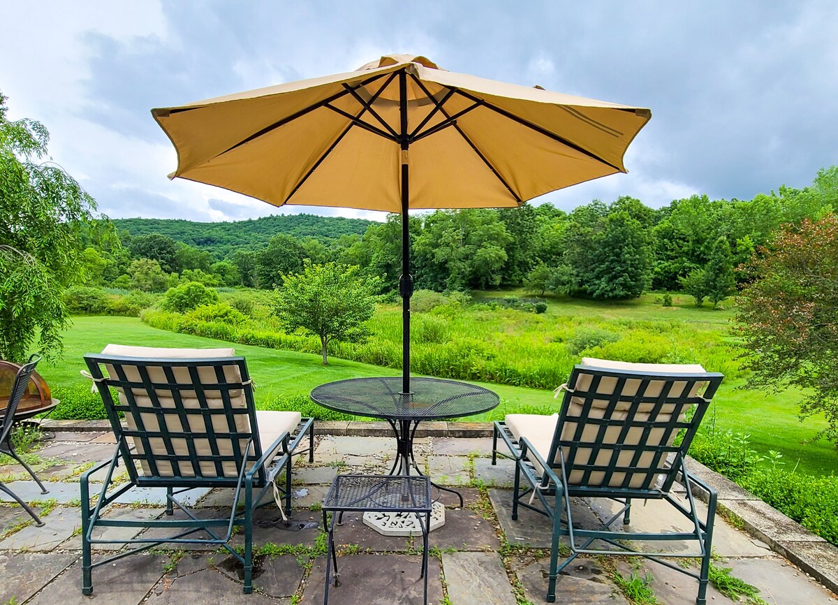 New York'tan bir saat uzaklıkta, 5 yatak odalı, 3,5 banyolu, lüks, tenha bir ev, Appalachian patikasının geçtiği 9 dönümlük bir mülkte. Modern rustik tasarım, yerden tavana pencereler, özel mutfak, son teknoloji ürünü cihazlar, balkonlar. Isıtmalı havuza (mevsimlik) veya jakuziye dalın, sauna yapın, barbeküden açık havada yemek yiyin ve yıldızları izleyin. Misafirler özel verandada sabah kahvesinin veya odun şöminesinin önünde akşam kakao veya dışarıda özel bir gölete bakan ateş çukurunun tadını çıkarabilir.