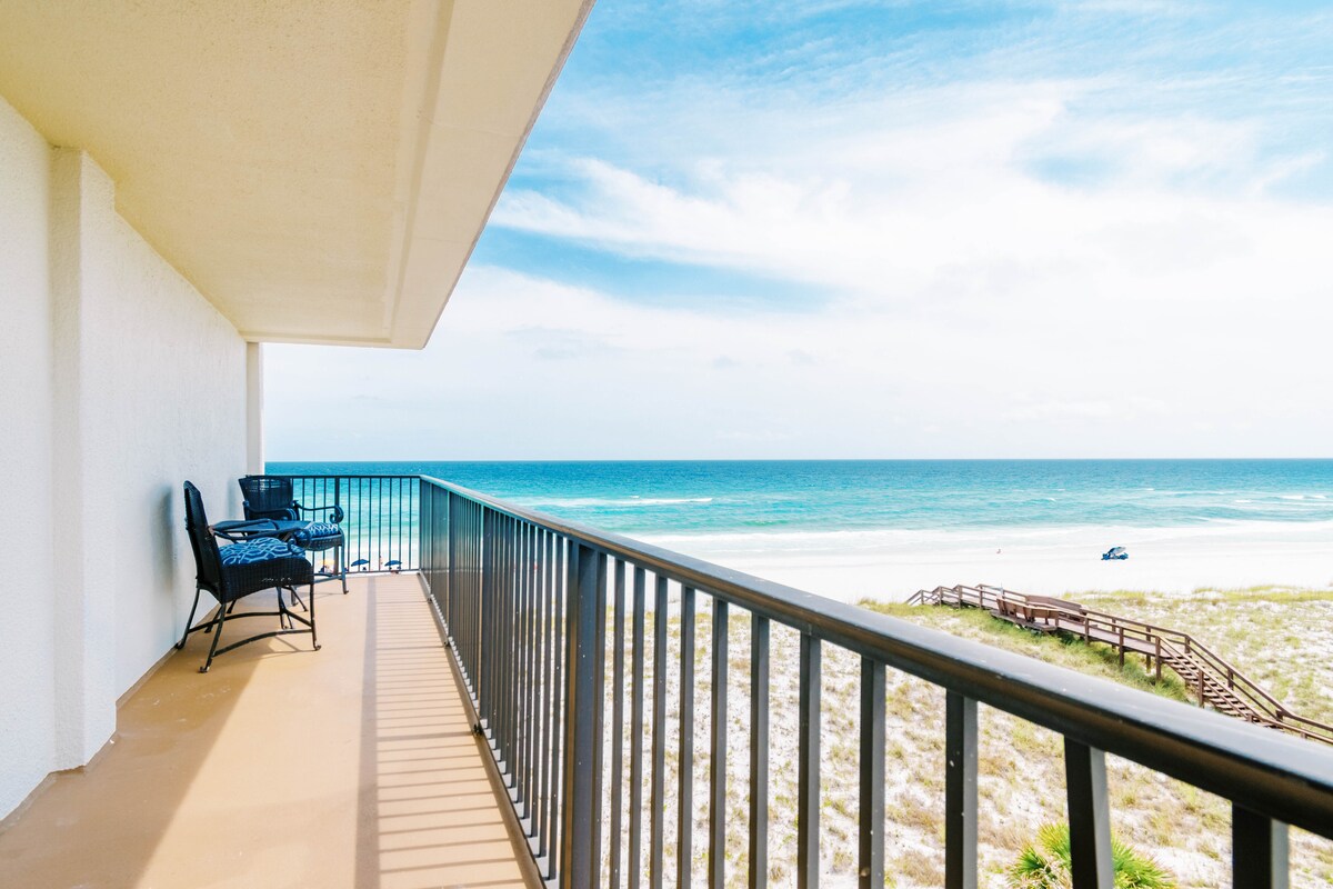 Welcome to your 3/3 front-row seat to the Gulf. This beautiful 5th-floor beachfront condo sits directly on the sugar-white sands of Navarre Beach, offering sweeping views, calming waves, and unforgettable sunsets from your private balcony. Whether you’re here to relax, reconnect, or recharge, this coastal retreat delivers the quiet charm Navarre Beach is known for—without the crowds