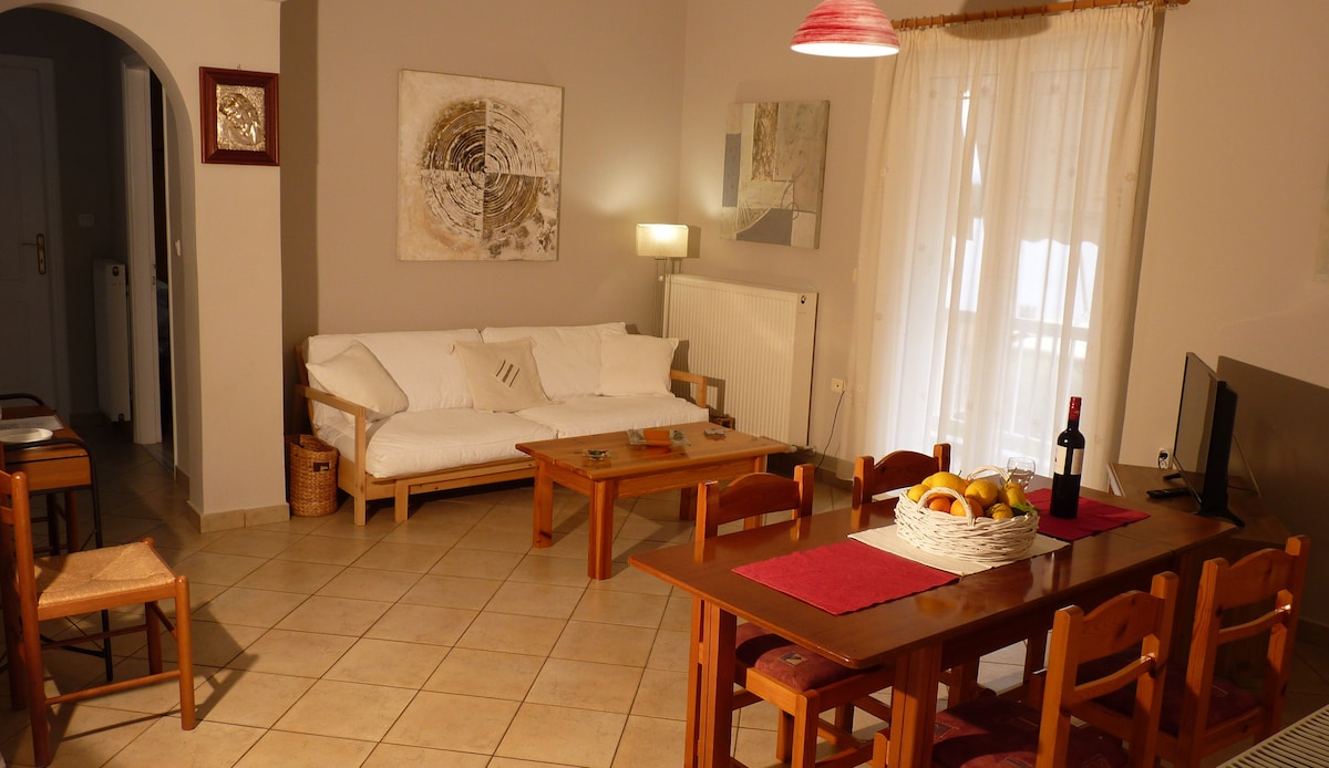 Burası plaja sadece birkaç dakika yürüme mesafesinde taş bir stüdyodur. İyonya'nın en popüler ve güzel limanlarından biri olan Kioni limanına kısa bir yürüyüş mesafesinde olmasına rağmen, diğer tarafta kısa bir yürüyüş mesafesinde, çiftçilerin hayvanlarını tuttuğu ve zeytin ağaçlarıyla toprakları hasat ettiği kırsal bir alanda bulacaksınız. Bu bir tartışma konusudur, ancak iki çelişkili yaşam tarzının buluştuğu yer burasıdır. Ithaca topraklarının hediyeleri olan en kaliteli ürünlerle sıcak bir karşılama sizi bekliyor.