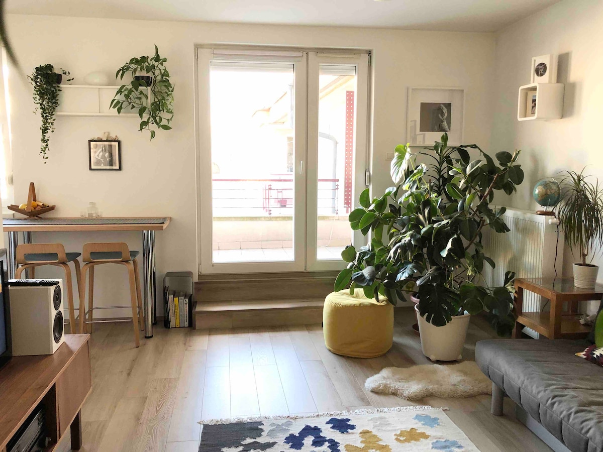 Harika bir balkonu olan aydınlık şehir dairesi.