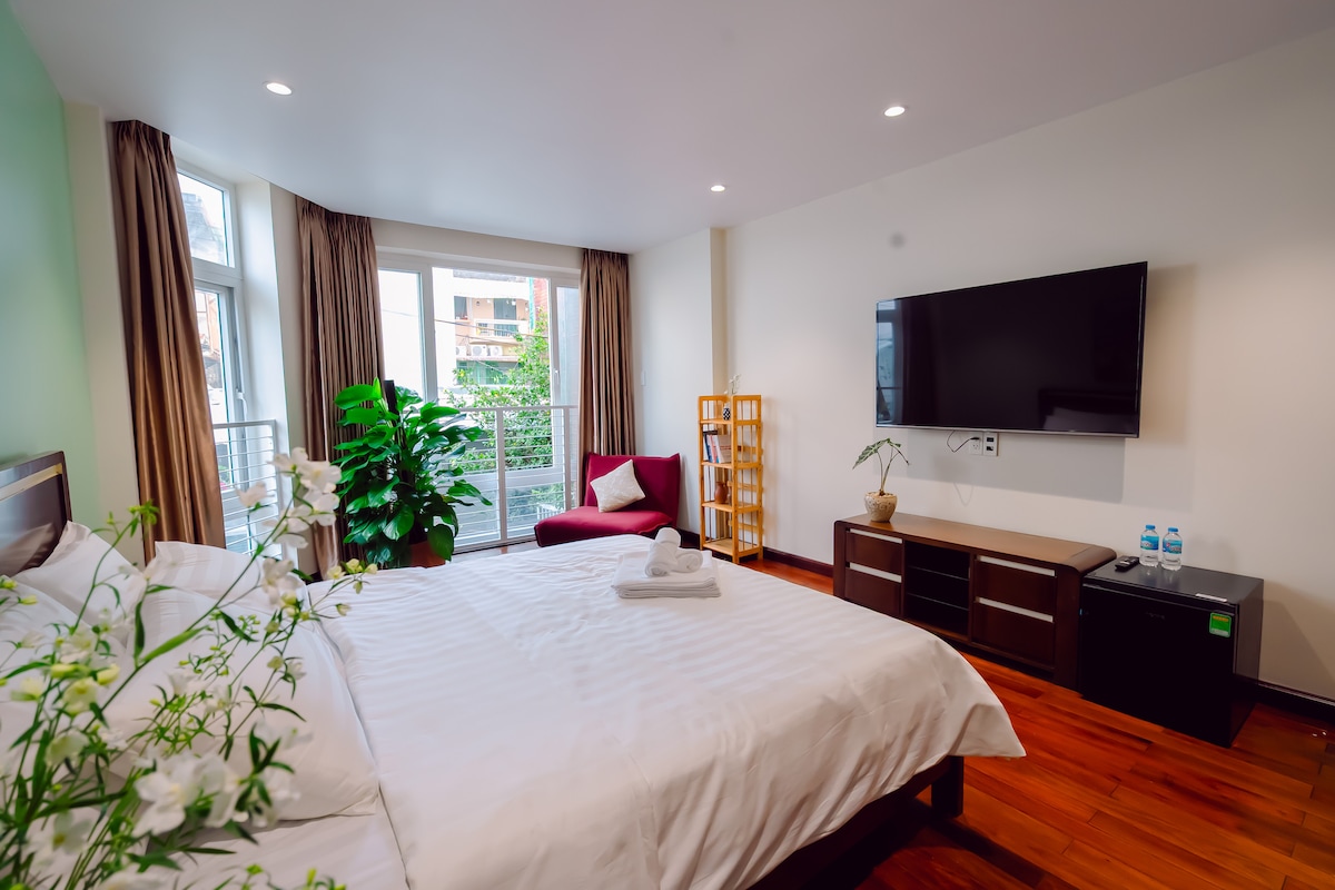 Tam donanımlı stüdyo 27 m2 balkonlu Konforlu Dunlopillo şilteli 1 king boy yatak Özel mutfak, banyo, buzdolabı, TV Açık hava bahçesi İngilizce, Vietnamca konuşan ev sahibi, internet 70 Mbps Uygun konum: Ana yola 10 metre uzaklıkta Havaalanından, tren istasyonundan, Notre Dame'dan taksiyle 15 dakika. Ben Thanh pazarına, şehir merkezine 20 dakika mesafededir. Beyaz Saray, Adora, Quan Khu 7 gibi kongre merkezlerine 5 dakika mesafededir. Pazarlara, mağazalara, restoranlara yürüme mesafesinde...