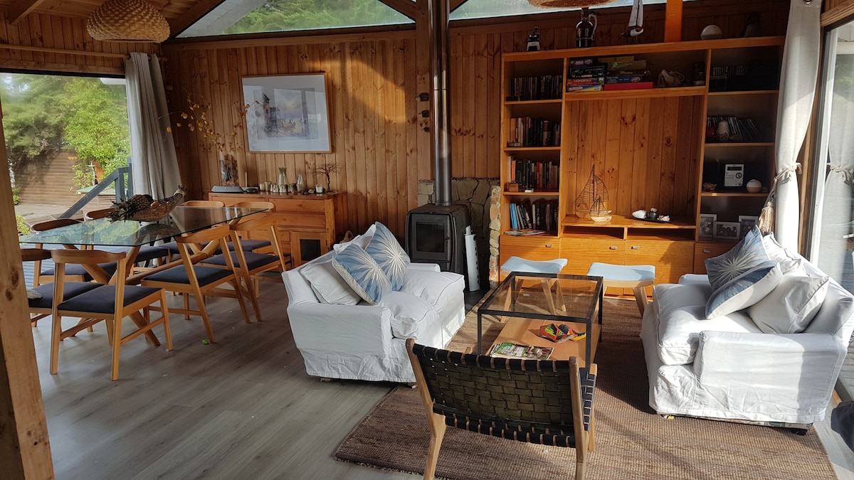 Bu konforlu, rustik görünümlü, doğa ile iç içe ve Pichidangui Körfezi manzaralı kulübede arkadaşlarınız veya ailenizle birlikte dinlenin. Her ikisi de çift kişilik yataklı, biri ebeveyn banyolu iki oda. Ada yemek odası, açık mutfak, buzdolabı, mikrodalga fırın, fırınlı gazlı ocak ve mutfak gereçleri, genel olarak 6 kişilik. 3 kişilik ve 2 kişilik koltuklu oturma odası, Starlink antenli internet ve 50" HD4k TV. Bosca pelet sobası.