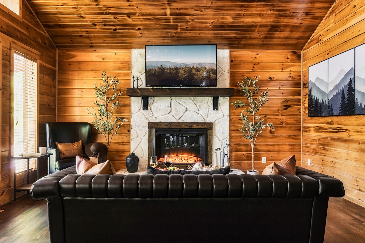 Bu kulübenin neden Airbnb'de en iyi %5'te olduğunu görün! Muhteşem, park yolu ve adaya 1 mil! Dinlendirici bir gece için 2 geniş King Master Süit. 2 tam özel banyo, yataklı kanepe, sauna, jakuzi, oyun odası ve ateş çukuru! Birçok olanak. Özel balkona açılan 3 Fransız kapısı olan bu açık 1 katlı yeri seveceksiniz. Vadi manzaralı ön verandada dinlenin veya geniş arka bahçe alanındaki jakuzinin keyfini çıkarın. Yaşam alanının yüksek tavanları ve dinlenmek için rahat bir şöminesi vardır.