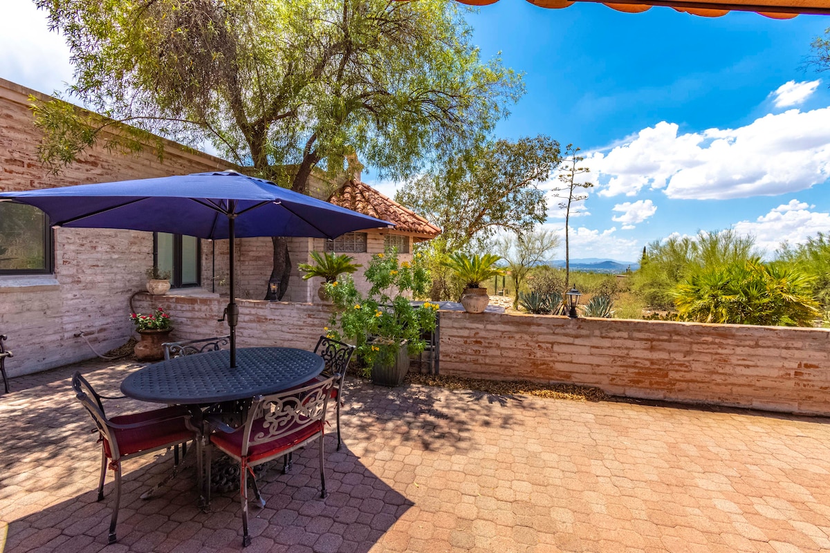West Foothills'te, 17 dönümlük pitoresk bir mülk üzerine kurulmuş bu huzurlu 1 yatak odalı casita'ya çekilin. King boy yatak, klima/ısıtıcı, RO suyu, buz makinesi, mikrodalga fırın, ocak/fırın, 220 kanallı 65" Roku TV, hızlı kablosuz internet bağlantısı, ünite içi çamaşır makinesi/kurutucu ve oyun masasının keyfini çıkarın. ~800 fit kare konfor ve cazibe. Silverbell Rd'den Ironwood Hill Dr'ye sadece 2 mil, UofA'ya 6 mil. Kusursuz bir şekilde temiz ve davetkâr, sakin bir kaçış için mükemmeldir. AZ TPT Lisansı 21337578