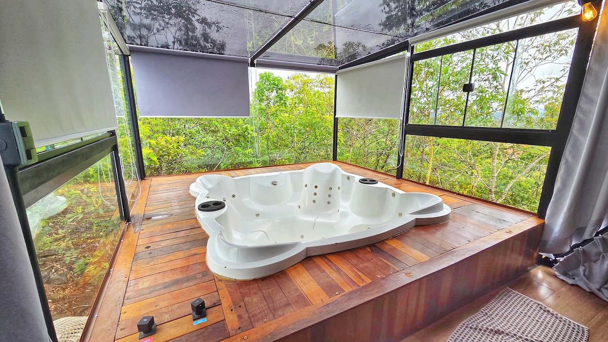 Jakuzi, şömine ve unutulmaz bir manzaraya sahip özel üçgen çatılı kulübe. Pirenópolis'in tarihi merkezine sadece 10 dakika mesafede, doğayla çevrili özel bir mülkte. Açık havada ısıtmalı jakuzide dinlenin, panoramik verandadan gün batımını izleyin veya soğuk geceleri şöminenin yanında ısıtın. Benzersiz anlar arayan çiftler veya aileler için cam cephe, modern tasarım ve maksimum konfor.