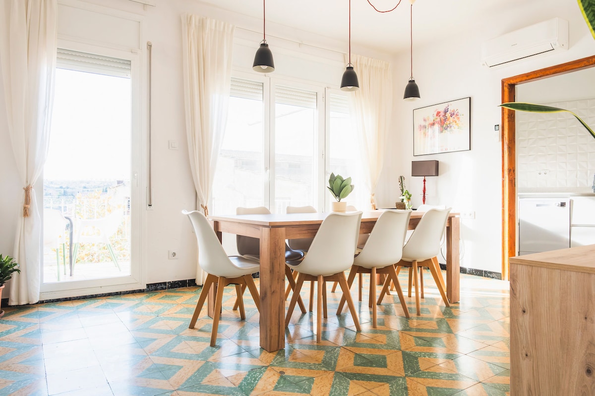 Salou'nun merkezinde sessiz bir çatı katı. Sahile 3 dakika yürüme mesafesinde. Panoramik manzaralı özel teras ve güneşlenme alanı, güneşlenmek veya gün batımını izlemek ve bir içki içmek için mükemmeldir. Gerekli olan her şeyle tam donanımlıdır (barbekü, klima, havlu, yatak takımı, saç kurutma makinesi, ütü, Nespresso kahve makinesi, sıcak su termosu...) - Çam ormanları, eğlence alanları, restoranlar, barlar ve toplu taşıma araçlarına yakın. İyi bağlantılı, Portaventura/Ferrariland/Caribe Aq. Parks'a 5 dakika.