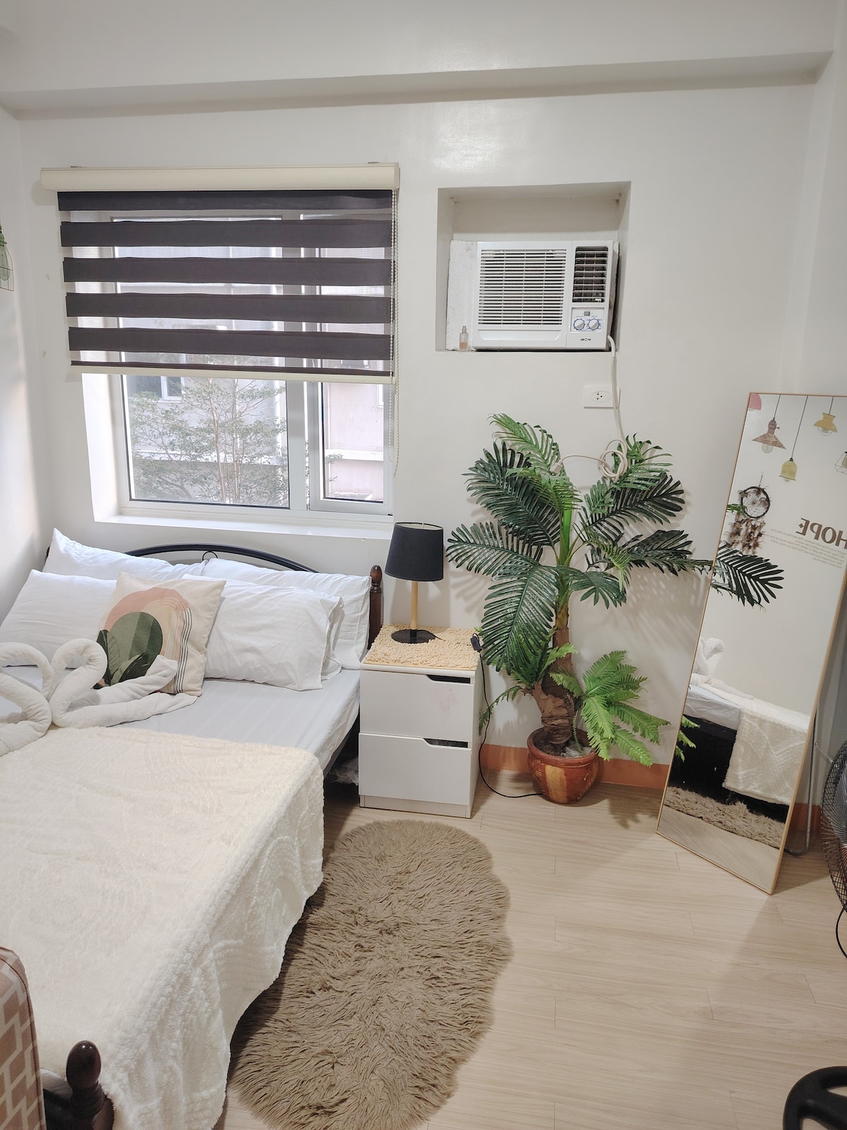 San Pablo Malolos Bulacan'da yeni yenilenmiş, temiz ve sessiz bir daire. McArthur otoyolunun hemen dışında merkezi bir konumdadır. NLEX Balagtas çıkışına kolay erişim, Philippine Arena'ya 25 dakika, DPWH'ye 10 dakika, S&R'ye yürüme mesafesinde, Robinson's Mall'a arabayla 10 dakika. 2 araç ücretsiz park yeri, tuş takımı girişi. Çalışma masası, TV, üst katta 2 kişilik tam boy yataklı yatak odasında klima, alt katta her birinde vantilatör bulunan bir ranza. Oturma odasında tavan vantilatörü, daha büyük buzdolabı, duş ısıtıcısı, elektrikli ocak ve mutfak gereçleri.