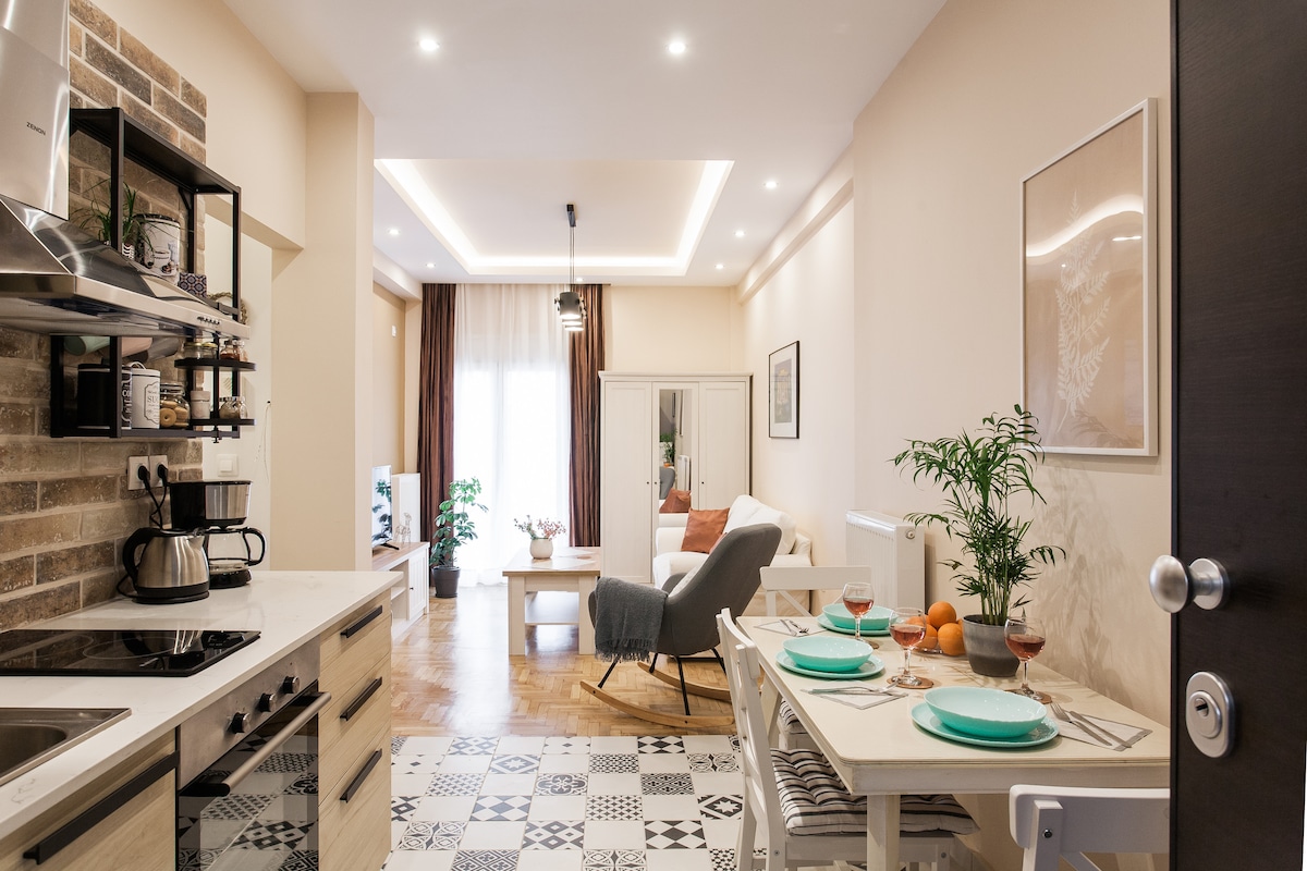 A newly renovated apartment conveniently located in the heart of Athens. Inspired by a love for Mid Century Design, every detail in this home has been carefully selected to provide a retro look with all the modern conveniences. Only a 3 minute walk to the nearest metro station and 4 stops away from Monastiraki Sq, you'll have easy access to all the must-see attractions of Athens.
