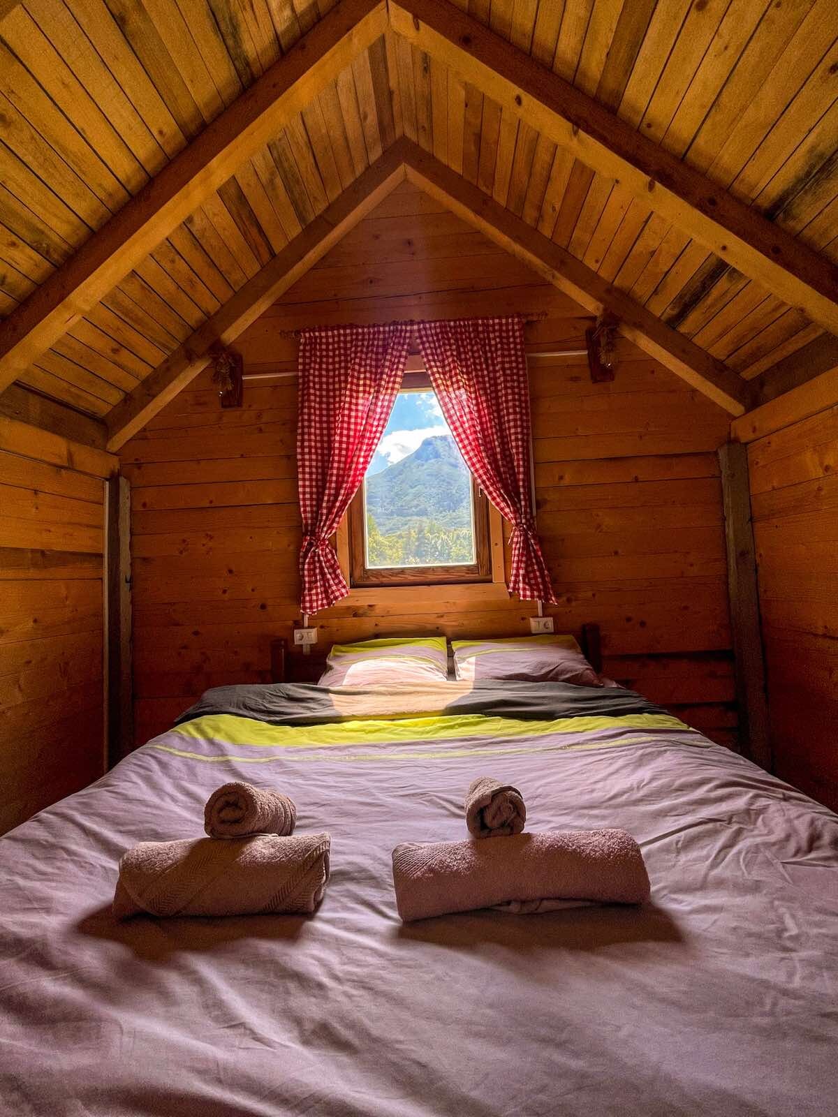 Bu ahşap kulübe mülkümüzün tepesinde duruyor. En iyi manzara buradan görünür. Evin her tarafında dağları en iyi şekilde görebilirsiniz. Resimlere baktığınızda iki kişilik yatağa sadece küçük bir merdivenle ulaşılabileceğini veya alt kattaki çekyatta uyuyabileceğinizi görebilirsiniz. Ateş yakıp barbeküde yemek yapabileceğiniz bir yer var. Terasta 1 Mayıs'tan 1 Ekim'e kadar her gün kahvaltı servisi yapacağız.