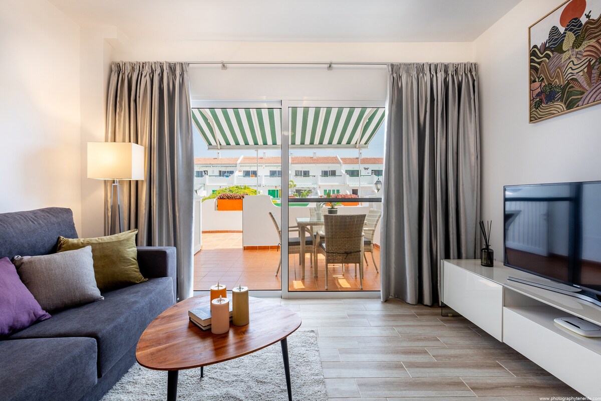 GOLDEN BEACHFRONT OASIS. Newly renovated, perfectly located, fully furnished luxury apartment with a private terrace overlooking the Atlantic Ocean and just a few steps from Playa Amarilla beach. Peaceful and away from crowded areas, yet close to supermarket and restaurants. Only 15 minutes by car from Tenerife South Airport. Free parking right under the apartment. Community pool. Experienced Superhost with over 2.200 reviews.