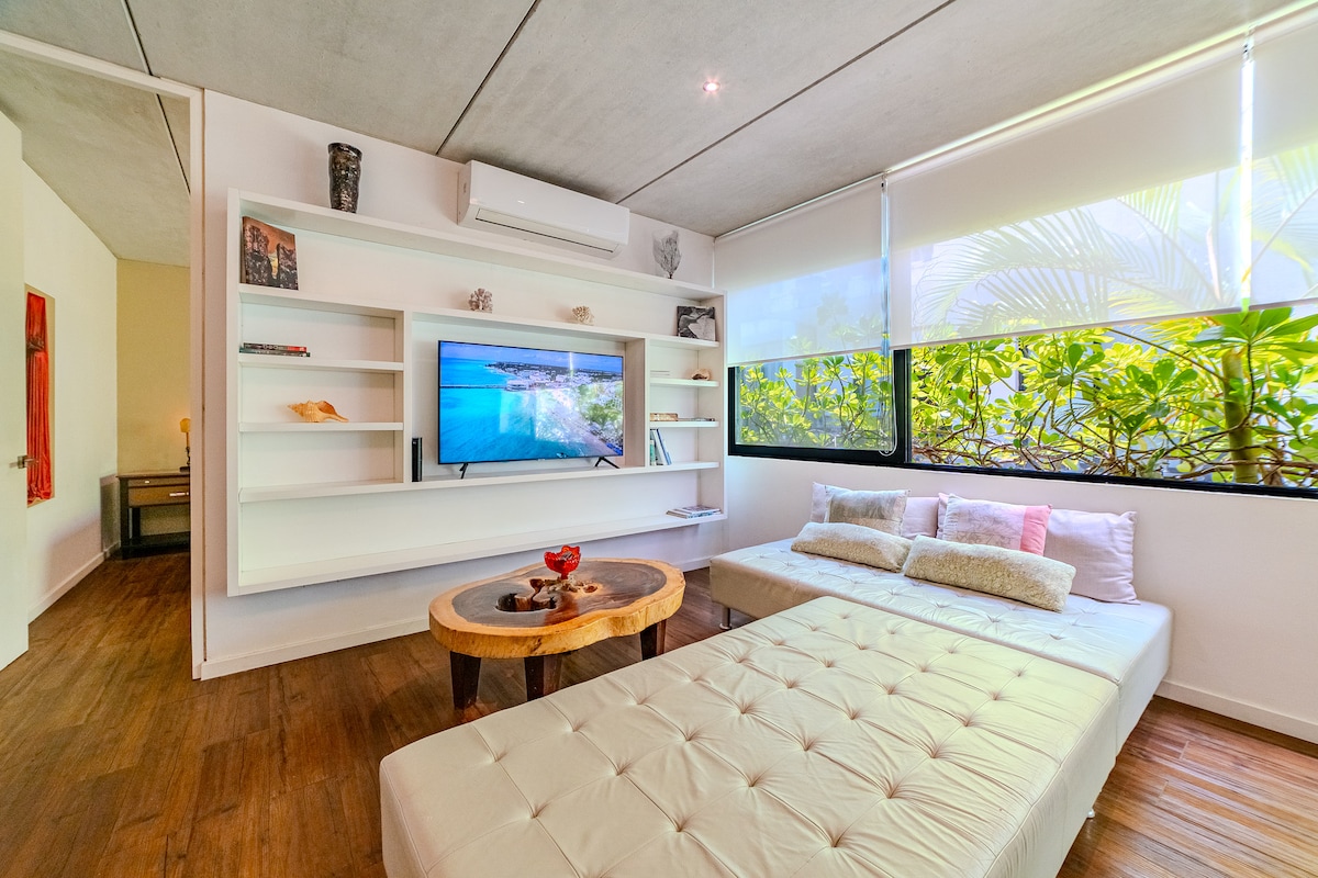 Playa del Carmen'in kalbinde inanılmaz yeni 2 yatak odalı daire - Her şeye yakın olan bu tam donanımlı bohem tasarımlı ünitenin keyfini çıkarın. Restoranlar - Bar ve sadece yürüme mesafesindeki en iyi yerler - 5. cadde bir blok ötede ve plaj sadece iki blok daha yürümek için. Günlerinizi geçirmeyi seveceğiniz en büyük terasa sahip dairede sunduğumuz yüksek hızlı kablosuz internetin ve konforun keyfini çıkarın. Cuna y silla de bebe esta sujeto a disponibilidad.