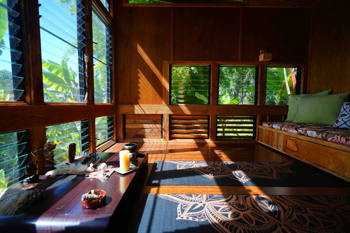Re•Treat at Hamakua offers more than a stay — it’s a living immersion in nature, community, and renewal. Wake to the scent of flowers and the gentle song of birds in your private garden retreat. With its own entrance opening directly into the Sanctuary’s lush gardens, this room offers peace, privacy, and the simple joy of stepping straight into nature’s embrace. A restful haven where Aloha greets you each morning. Welcome to Hawaiian style living—organic, flowing, and alive.