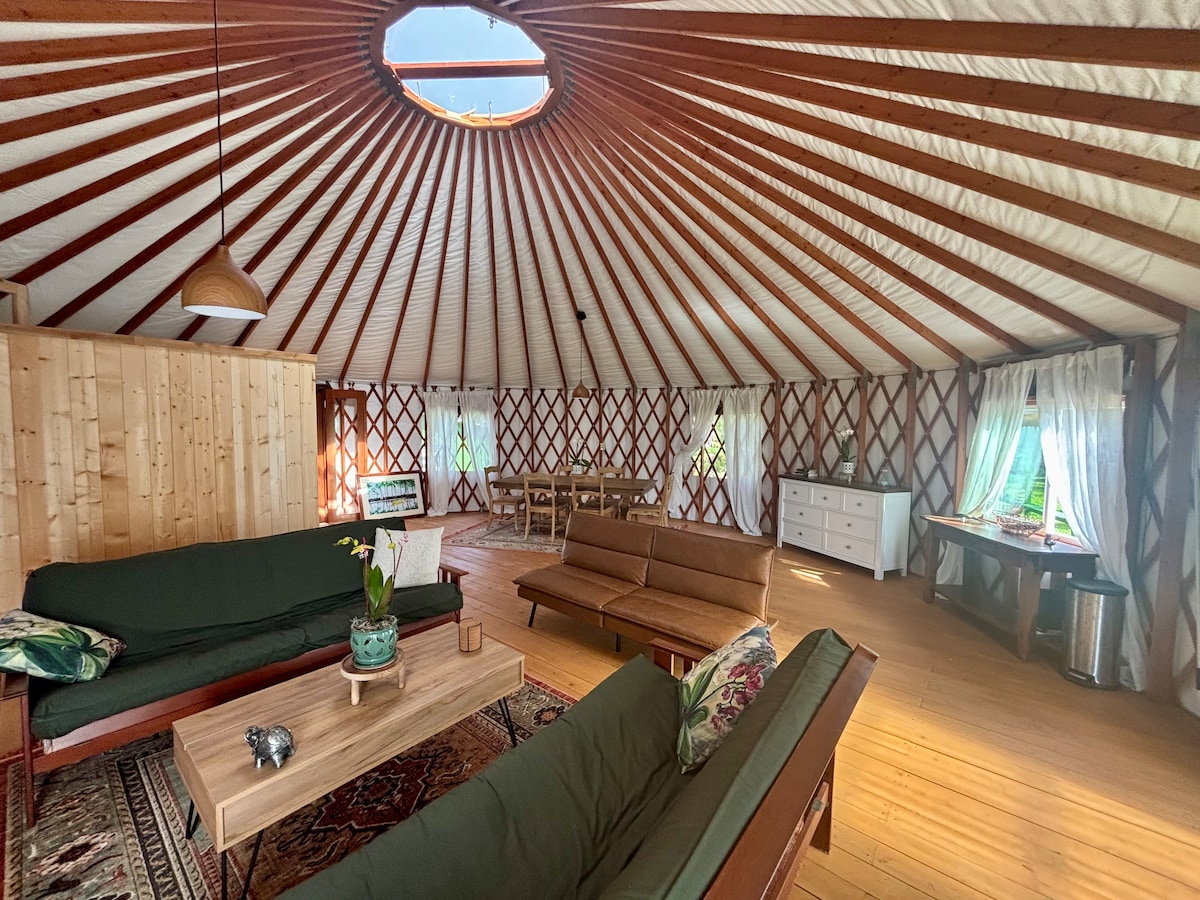 Yeni inşa edilmiş lüks spa banyosu ve gelişen organik çiftlikte kapalı/açık salon alanı ile çarpıcı geniş yurt. Ev konforuyla donatılmış bir yurtun tonozlu tavan penceresi ve yüksek tavanı altında doğaya yakın uyuyun. Bu güzel yapı, iyi döşenmiş bir mutfağa ve büyük küvetli ve fayanslı duşakabinli bir banyoya sahiptir. Kona kahve, narenciye ve muz bahçelerimizin tenha ihtişamı arasında spa banyosunun bitişiğinde iç ve dış mekan dinlenme alanları bulunmaktadır.
