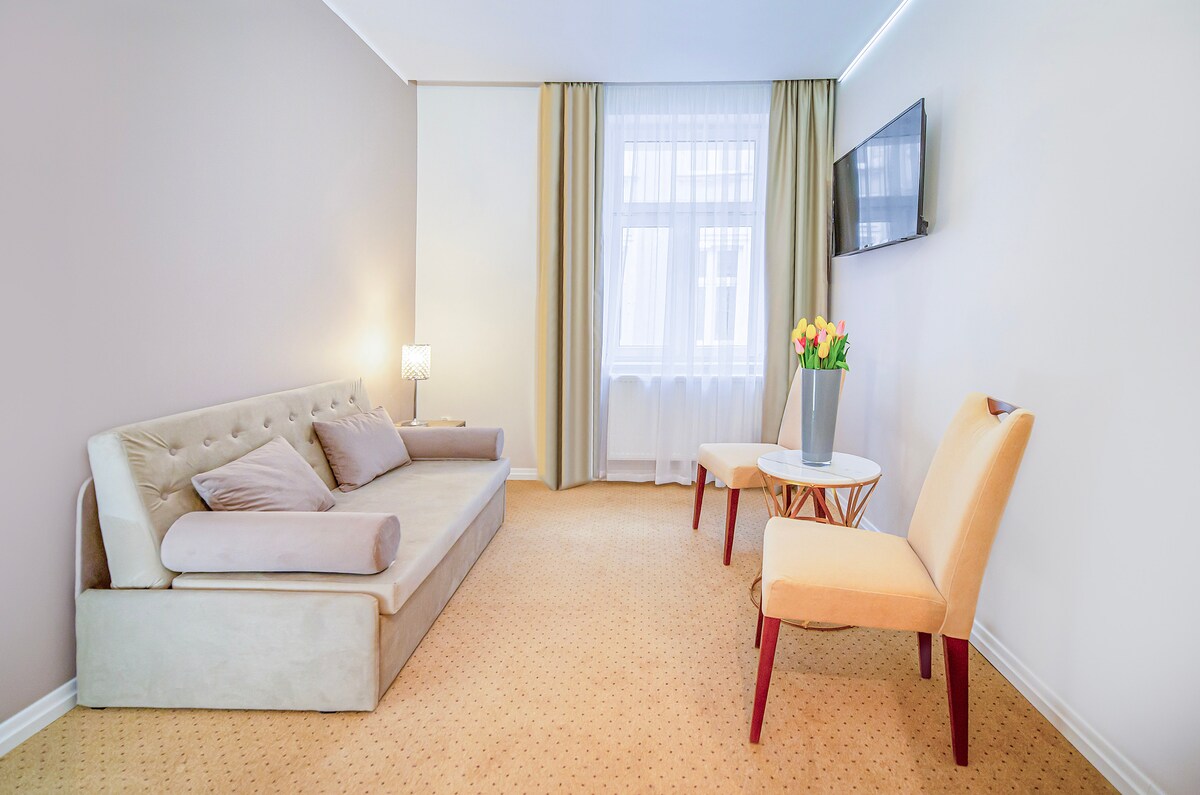 Przytulny pokój dwuosobowy w sercu miasta, tuż przy plaży. Komfortowe 19 m² dla dwóch osób, idealnie zlokalizowane blisko centrum i portu. Dwa pojedyncze łóżka można ustawić razem lub osobno — tak jak wolisz. Do dyspozycji gości: prywatna łazienka z prysznicem, telewizor, lodówka, czajnik, zestaw do parzenia kawy i herbaty oraz bezpłatne Wi-Fi. Idealne miejsce zarówno na weekendowy wypad, jak i dłuższy wypoczynek nad morzem.