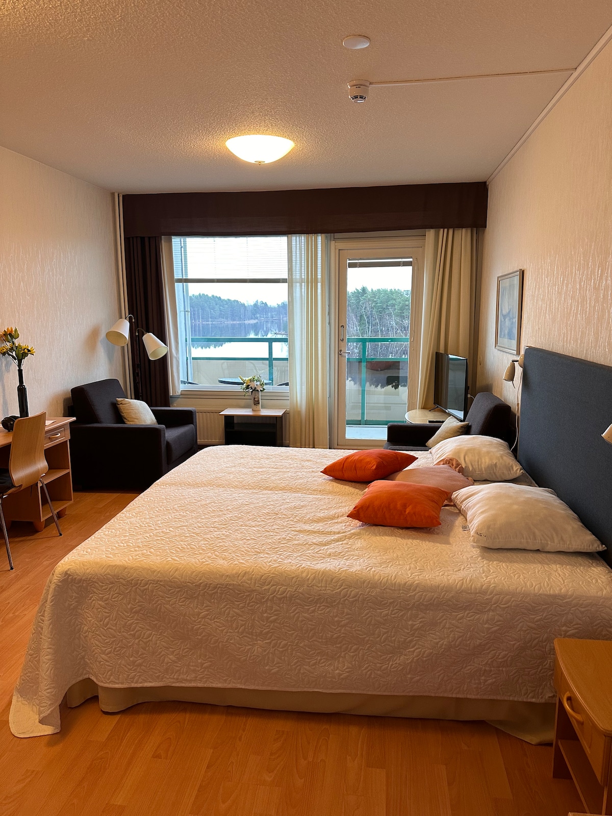 Daire 140 metrekare, geniş mutfak, 2 tuvalet, 2 duş, 2 düz ekran TV, yüksek hızlı internet, elektrikli araç şarjı, göl kenarında sauna ve plaj yaklaşık 100 m, geniş mobilyalı balkon, 1 çift kişilik yatak, şömine, 2 çift kişilik yatak, 3 dar yatak, çocuk yatağı, oh unikulman 2 kez 90 cm, çocuk açık planlı kanepe. Makineleri, fırını olan geniş mutfak, kiralık. Şehir merkezi K-Kauppa, eczane, taze sebzeler ve yerel dükkanlar yaklaşık 800 m. Kano/kayak/sundurma/ızgara/kullanıma hazır. En az 2 gün