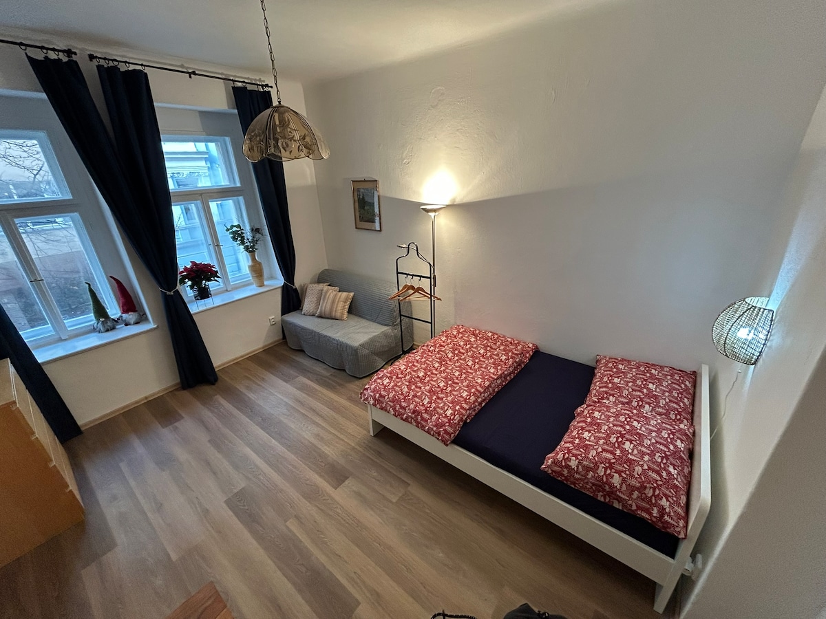 Sıkıcı otel odalarına karşı bir panzehir :) Dairem tarihi bir apartmanın birinci katındadır ve yüksek tavanlar ve parke zeminler gibi orijinal özellikleri 20. yüzyılın başlarındaki Prag konutlarının ihtişamını korumaktadır. Özellikler: - Mutfak (ve Nespresso) - Banyo, duş, çamaşır makinesi, yatak 200x160 cm. Semt 'yerel' cazibesini koruyor, merkeze seyahat etmek kolay ve yan tarafta harika bir Vietnam mağazası var.