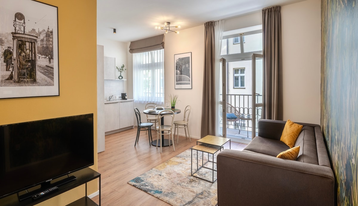 Ünlü mimarlık stüdyosu Nedvěd Architekti tarafından tasarlanan, konforlu yataklardan havlu ve kahve fincanlarına kadar her şeyi bulabileceğiniz yepyeni şık, tamamen mobilyalı daireleri deneyimleyin. Özenle yenilenen bina, tarihin en iyilerini korumuş ve modern konutların gerektirdiği her şeyi eklemiştir. Kendinizi rahat hissedin! • Prag'ın merkezine 5 dakika. • En yakın kafeye 80 metre. • Ana tren istasyonuna 1 durak. • Metro ve tramvaya birkaç adım uzaklıkta.