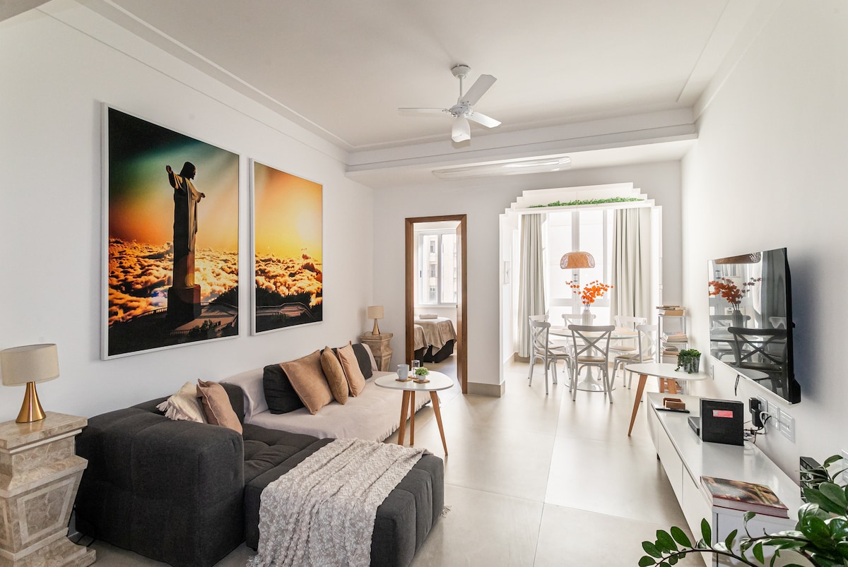 Copacabana plajında Boho şık tarzı daire! - Queen yatak, çekyat, yemek masası, klima ve ev ofisi için alan (Wifi 300 Mbps). Soba, buzdolabı, fırın, mikrodalga fırın, blender, kahve makinesi, meyve sıkacağı, sandviç makinesi, tavalar, mutfak aletleri, çeşitli kitaplar, gitar ve uygulamaları olan TV bulunan mutfak. - Bina altında pazar ve eczane, daire çevresindeki restoranlar ve mağazalar. - Havaalanı 8,3 km. - Cristo Redentor 11,5 km. - Pão de Açúcar 2,8 km.