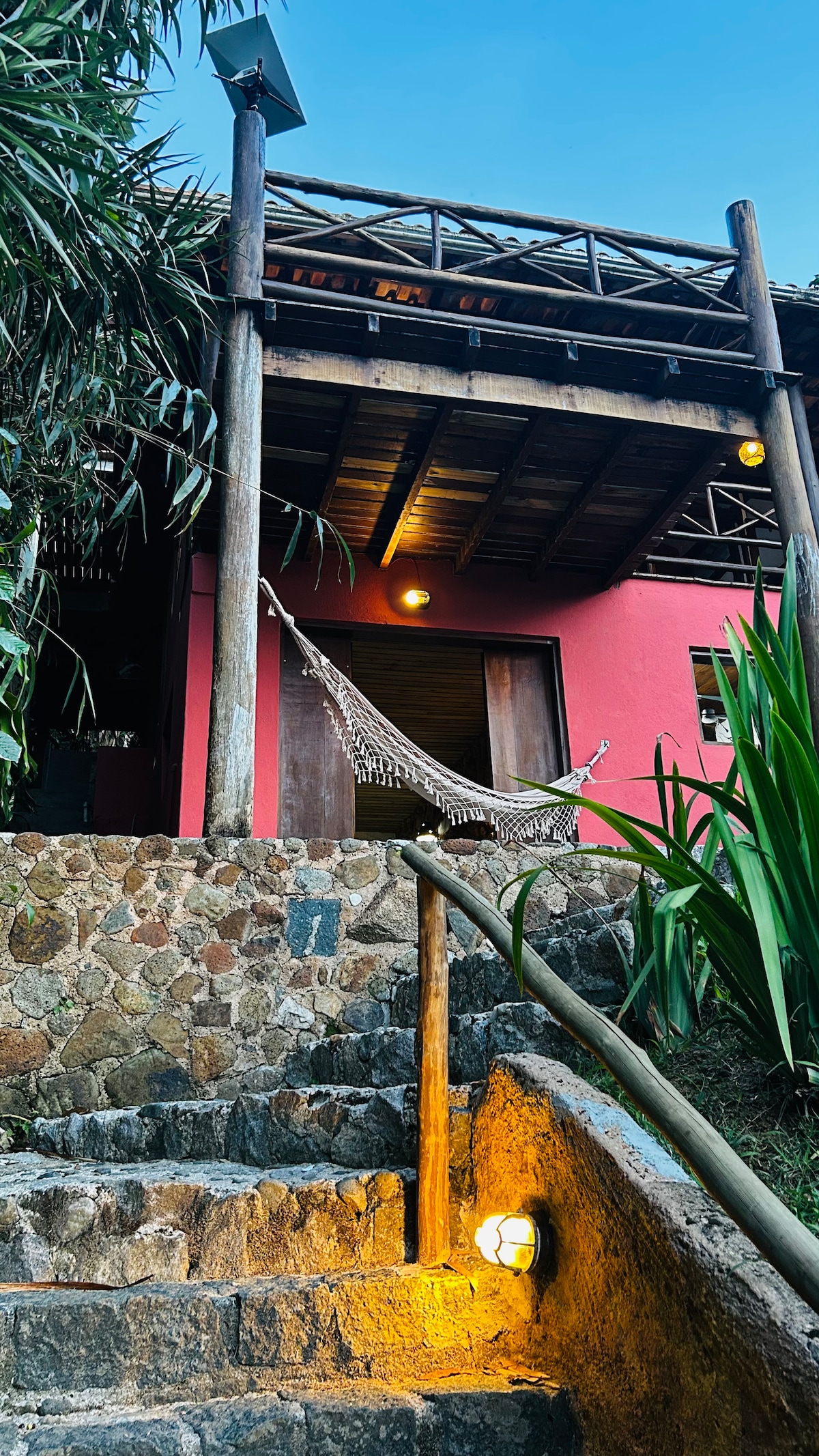 Complete house on a paradisiacal plot of land measuring 7,000m² with 9 other independent and private houses for couples . Casa Árvore has a large bedroom with air conditioning, Smart TV and WiFi internet, a fully equipped kitchen with all the items needed for a perfect stay, bathroom with gas powered shower and hairdryer, and a spacious balcony with a large table and sea views. and to the ornamental garden, facing the natural pool, which harmonizes the environment with the sound of the water!