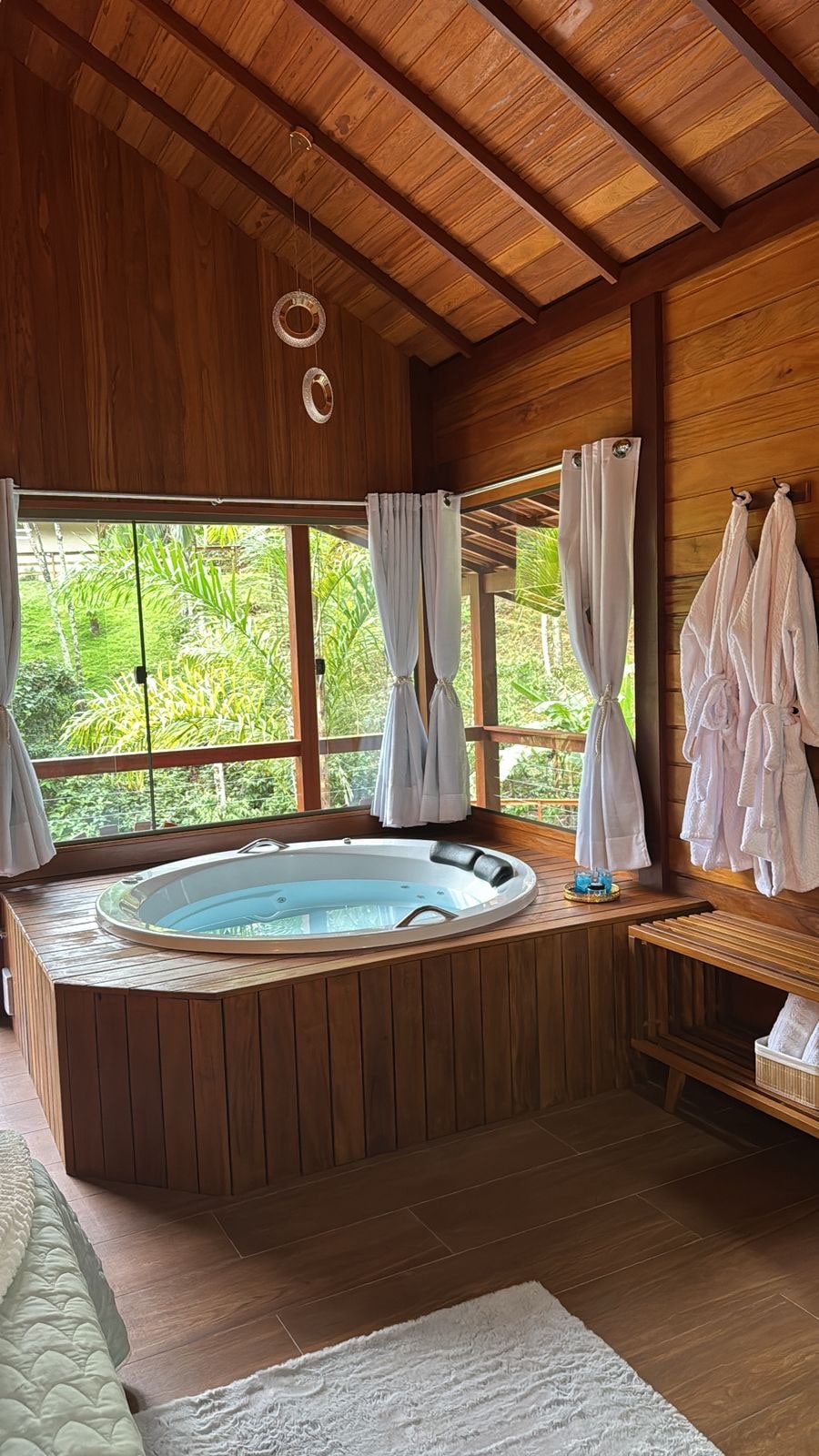 Bangalo'muzda iki süit bulunmaktadır. Bunlardan biri Emma marka King size yataklı ve jakuzili bir ana süittir. İkinci süitimizde çift kişilik yatak bulunmaktadır Evimizde tam donanımlı bir mutfak, oturma odasında geniş bir masa, oturma odasında 3 metrelik bir çekyat ve ücretsiz kanallara sahip 55 inç akıllı TV bulunmaktadır. Dış alanda bir ekosaunanız var. Mekânımız tamamen donanımlıdır ve doğayla çevrili olağanüstü günler yaşamanız için hazırdır. 20 dakikada Guarapari plajlarına ve 5 dakikada şelaleye gidebilirsiniz.