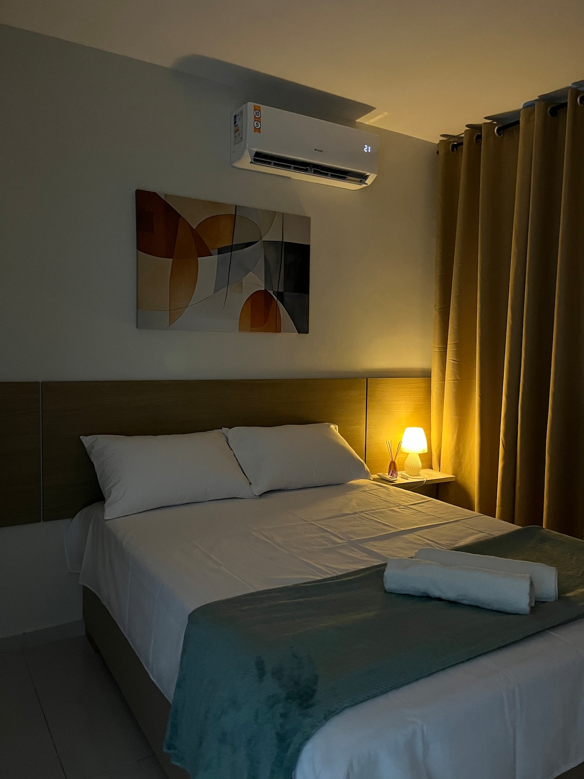 Flat Premium à Beira-Mar, pé na areia da melhor praia de João Pessoa. Estamos localizados na Praia do Bessa (Jardim Oceania), próximo dos melhores bares e restaurantes da cidade, de posto de gasolina, padaria, farmácia e Shoppings. O apartamento está preparado para receber até 3 pessoas, pois contamos com 1 cama de casal e 1 cama de solteiro auxiliar. Na cozinha contamos com Micro-ondas, fogão por indução, frigobar, liquidificador, cafeteira, sanduicheira e utensílios de cozinha.
