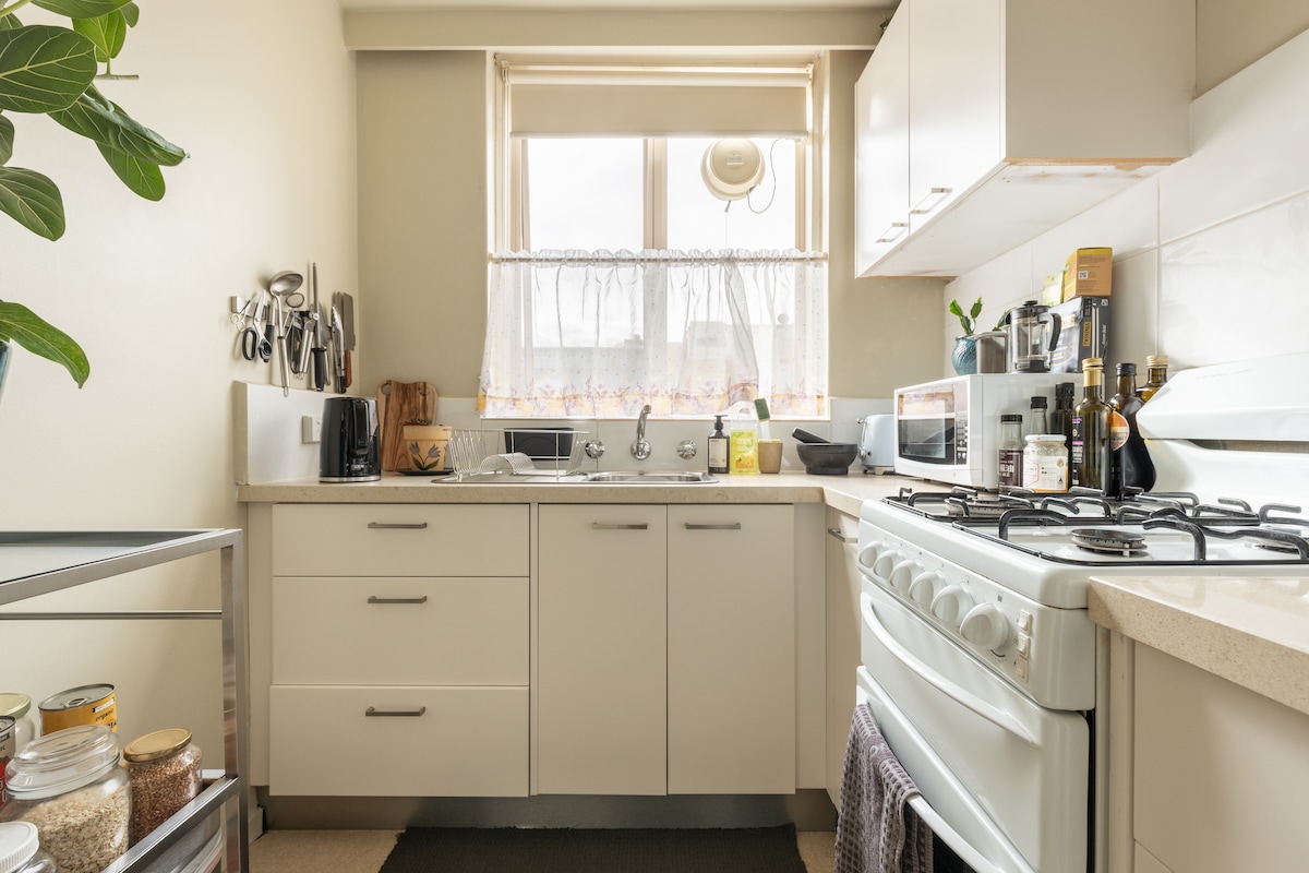 Bu güzel şık stüdyo, bir çift veya bekar veya ikiz paylaşımı için mükemmeldir; Melbourne CBD'nin en iyi yerlerine yürüme mesafesinde (veya tramvayla). Rezervasyon süresi, daha derin bir konaklama için en az altı gün, o kadar kolay ki başka bir yerde olmak istemeyeceksiniz. Kaliteli aletlerle dolu tam donanımlı bir mutfak; içeride/dışarıda ve iyi yiyin. Mükemmel hızlı kablosuz internet bağlantısı. Özellikler: rahat queen boy yatak (lateks kaplamalı yün şilte), stoklu mutfak, tesis içi çamaşırhane, klima, spor salonu ve yoga matı. Araç parkı düzenlenebilir.