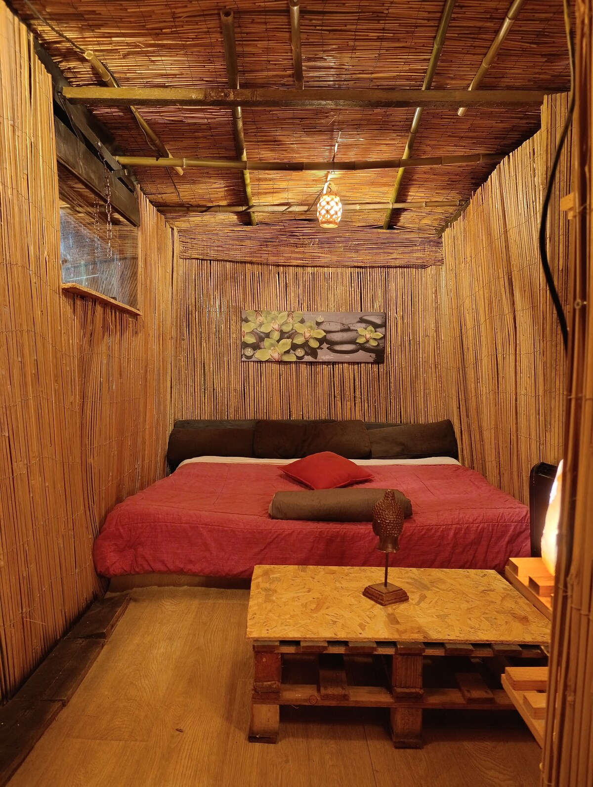 İki katlı taş ve ahşaptan yapılmış bir kulübe, büyük bir oturma odası, cam pencere, iki kişilik bir kanepe ve saunalı bir banyo; ikinci katta çift kişilik yataklı bir yatak odası var. Açık havada, barbekü ve ahşap bir masa ile donatılmış verandası olan büyük bir bahçe vardır. Site, Bellegra ve Olevano Romano arasındaki keyifli tepelerde bulunmaktadır. Şu anda, dört misafire ek olarak iki ekstra misafir için uygun olan harika bir Hint teepe'ye yerleştirilmiş iki yatak ekledik.
