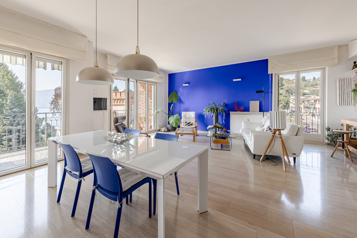 Bright lakeside apartment with stunning views of the lake and mountains. Renovated in Scandinavian style, it has a spacious open-plan area (living, dining, kitchen), three bedrooms, two bathrooms (one is 0.80 sqm), a balcony, and a large terrace. This is my home, filled with my original artworks. As an artist, I prioritize ecology and recycling. Free parking is available. Perfect for a relaxing stay on Lago Maggiore, blending nature, art, and sustainability.