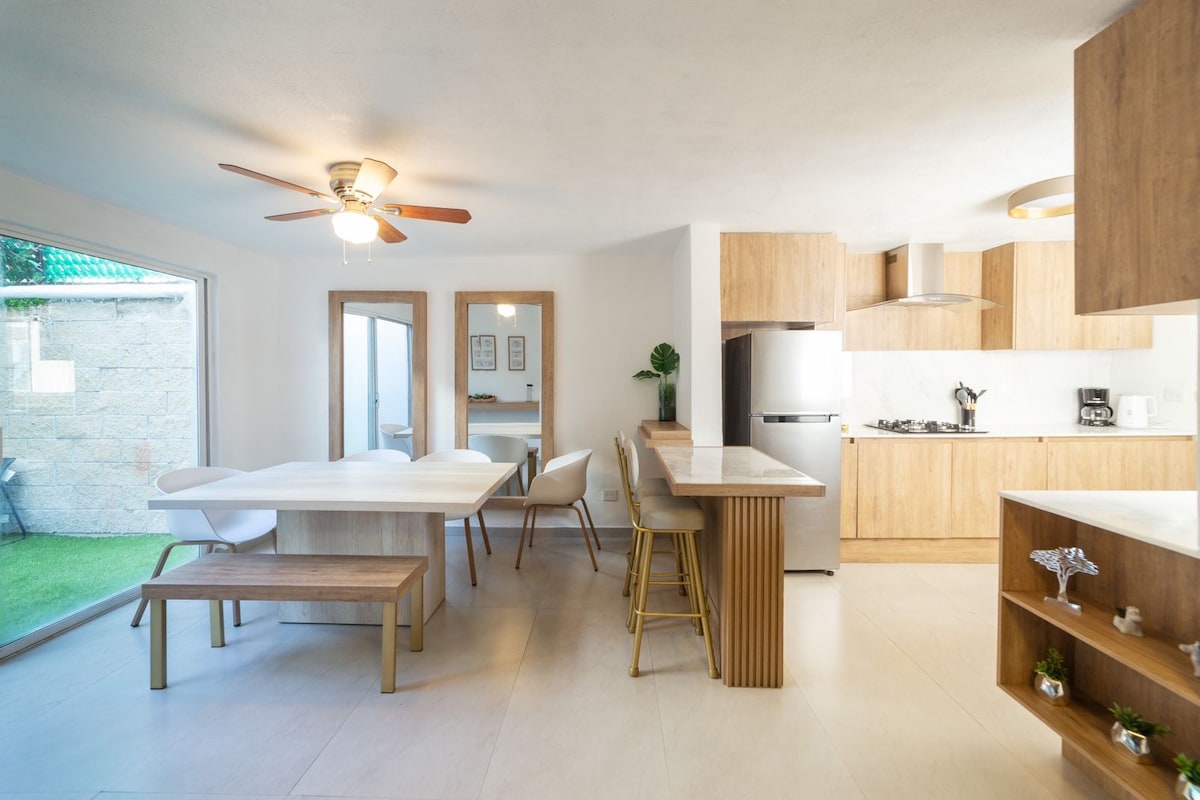 Un departamento residencial con mucho estilo ideal para disfrutar con tu familia, dentro de un exclusivo residencial con alberca. ••SI FACTURAMOS•• Cuenta con áreas comunes como alberca,dog park, ajedrez gigante, canchas de fut bol, juegos infantiles, etc. IMPORTANTE: Para el uso de alberca se debe solicitar las pulseras antes del inicio de la reservación. NO ofrecemos el servicio de aire acondicionado, lavadora o secadora.