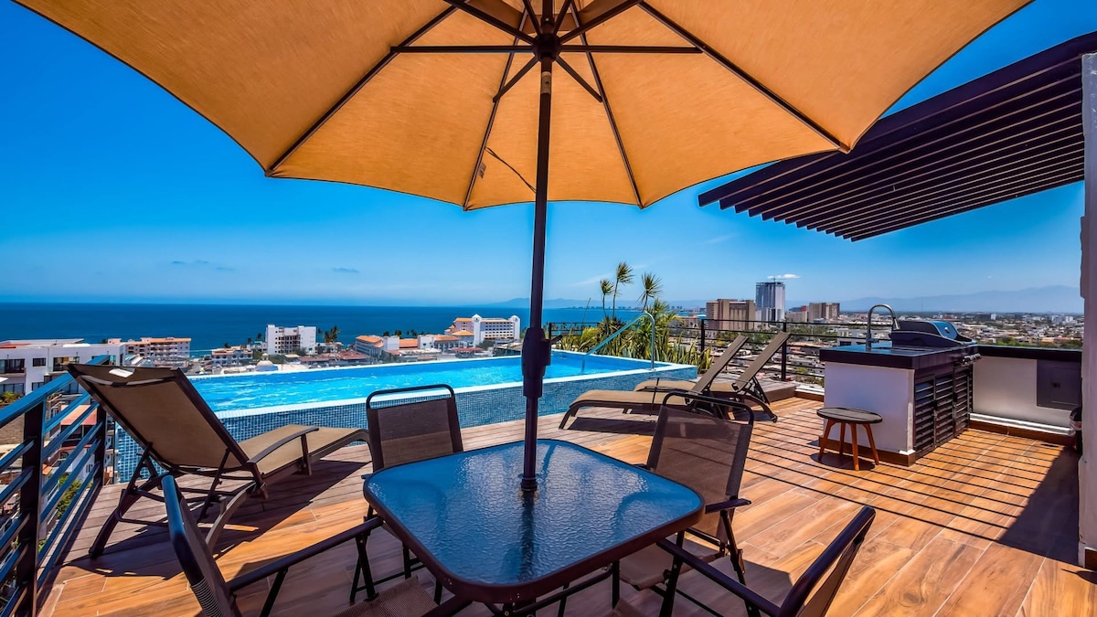 LUXURY! ROOF TOP INFINITY POOL & GYM! PRIVATE JACUZZI on the deck & WATER VIEWS from EVERY room of this sub-penthouse (including the 2 full bathrooms!) that is located in AMAPAS 353, a newer development in the heart of the romantic zone with the best ocean view infinity pool in the area! If the dates you want are not available, please click on my host picture (once to see my profile and then again to be taken to my other listing) to see my other unit in the same building. Thank you!