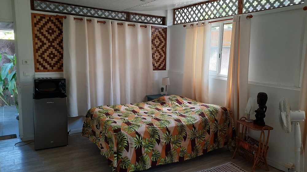 Özel mülkte dubleks bungalov, Uluslararası ve adalar arası havalimanı arabayla 10 dakika mesafede. Yüzebileceğiniz lagünün hemen yanında şamandıralı özel teras. 2 kayıkla gezinti ve kum yığınlarına erişim, fare Vaima'ya 100 metre mesafede. Zemin katta, donanımlı mutfak alanı + yemek odası + bir banyo. Üst katta, Moorea ve görkemli gün batımı manzarasına sahip büyük bir klima + teraslı oda. 24 saat açık süpermarket 10 dakika yürüme mesafesinde.