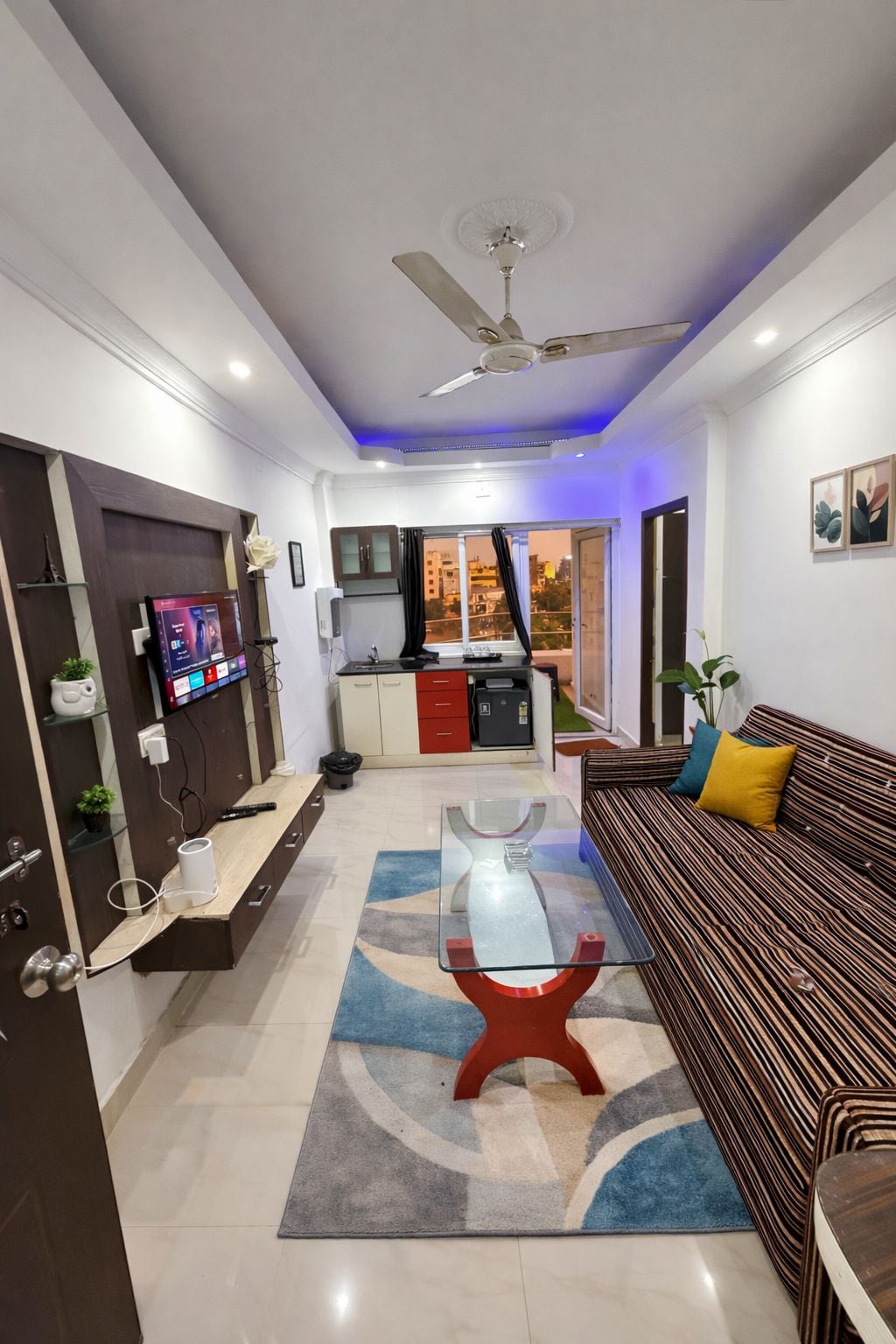 This is a 1Bhk Flat , Best for Small Family (2Adults & 2 child) and Couple. But if you are a group and want to stay together we can provide Extra Mattress. Bedroom: one Double bed with TV & AC , Living Room: Single Sofa cum bed ,Fan & Light. Extra mattress is also There. Kitchen is fully equipped for Four adults. Now cylinder is a global problem. For that we are charging extra per day Rs 300. Refrigerator is there