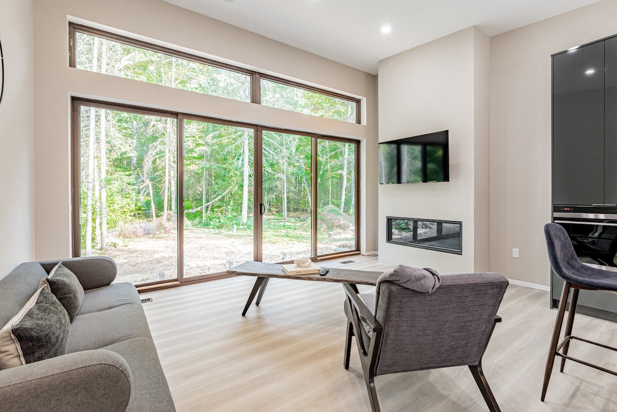Escape to Luxury Cottage 45 – Main, a peaceful forest retreat with lake and resort access. This spacious 1-bedroom cottage features large windows, a private deck, and beautiful nature views. Enjoy a fully equipped modern kitchen with premium appliances and quartz counters. Unwind in the spa-inspired bathroom with a deep soaker tub and rain shower. Luxury linens, plush robes, Nespresso coffee, and premium bath products make your stay relaxing and indulgent.