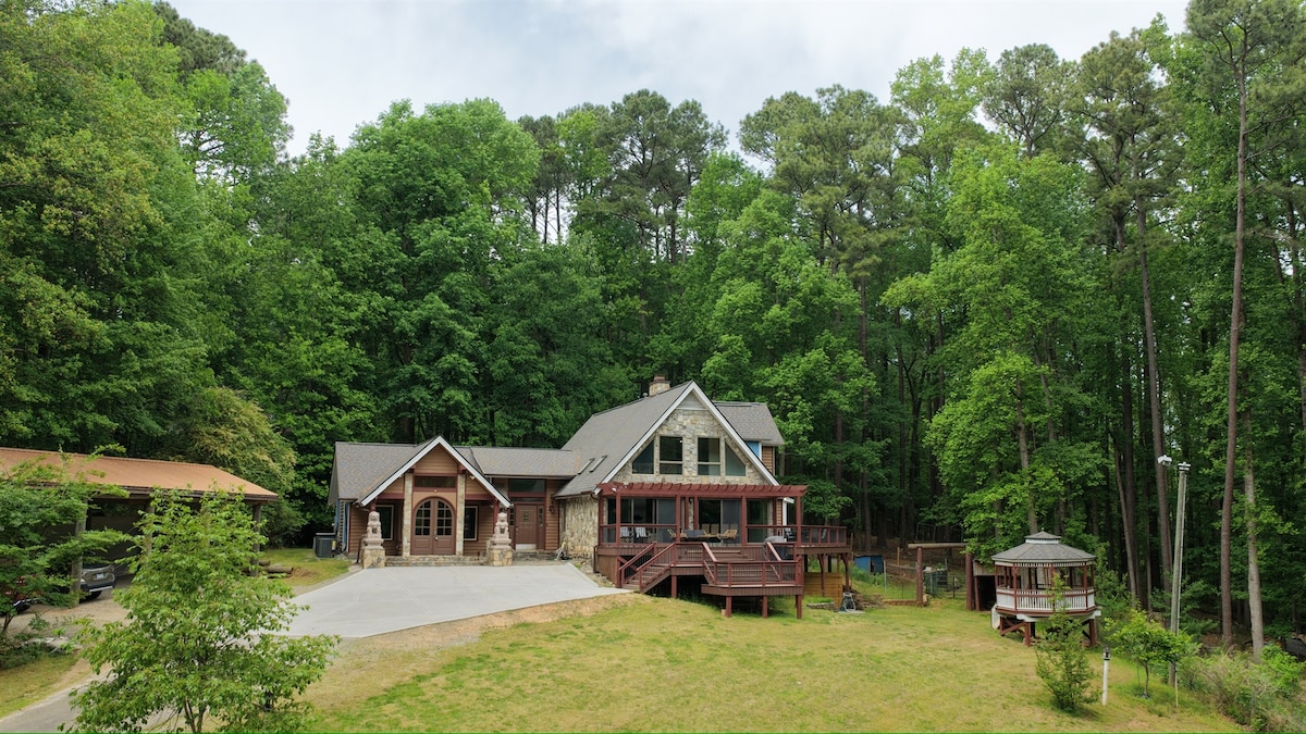 İkonik bir aslan taşı kapının arkasında yer alan bu özel 5 dönümlük tepe mülkü, RDU Havalimanı'na sadece 10 dakika mesafede, Research Triangle'ın göbeğindeki aile toplantıları, kurumsal inzivalar ve yönetici konaklamaları için idealdir. Yemek odası ve geniş üç katlı teras, bir pickleball ve küçük basketbol sahasına bakıyor ve hem aktif oyun hem de rahat sohbet için mükemmel bir ortam yaratıyor. Akşamları özel sinema odasında 192 inç projektör ekranı ve sürükleyici surround ses ile bir araya gelin.