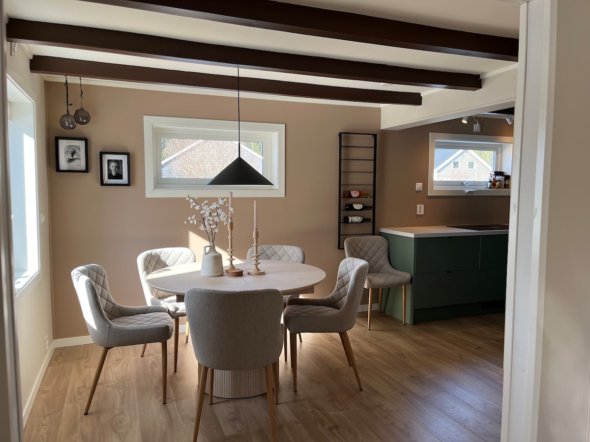 Her vil dere bo godt med uforstyrret utsikt mot fjord, fjell og by. Det er direkte tilgang til fjorden og naturreservat noen meter nedfor huset. Kun 7 minutter fra sentrum og 2 minutters gange til dagligvarebutikk, post og buss. Det er hele 4 soverom med komfortabel sengeplass til 6 personer. Fullt oppdatert kjøkken med alt som skal til for å lage festmåltid. Gratis elbil lading for opphold 3+ døgn. Bad med badstu, badekar og regndusj med fjordutsikt må oppleves! Velkommen😊