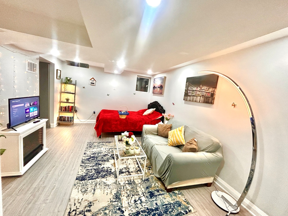 Rahat bodrum dairemize hoş geldiniz! Bu modern Airbnb, Toronto şehir merkezine arabayla 40 dakika ve Niagara Şelaleleri'ne bir saat uzaklıkta huzurlu bir yerleşim alanında bulunmaktadır. İyi aydınlatılmış mekânda rahat bir queen boy yatak, geniş dolapta geniş bir depolama alanı ve büyük pencerelerden akan doğal ışıkla güzelce tasarlanmış bir iç mekan bulunuyor. Not: Oturma odasında yere yerleştirilebilecek 2 adet tek kişilik katlanır yatağımız bulunmaktadır. Ekstra nevresim takımı ve yastıklar sağlanmaktadır.