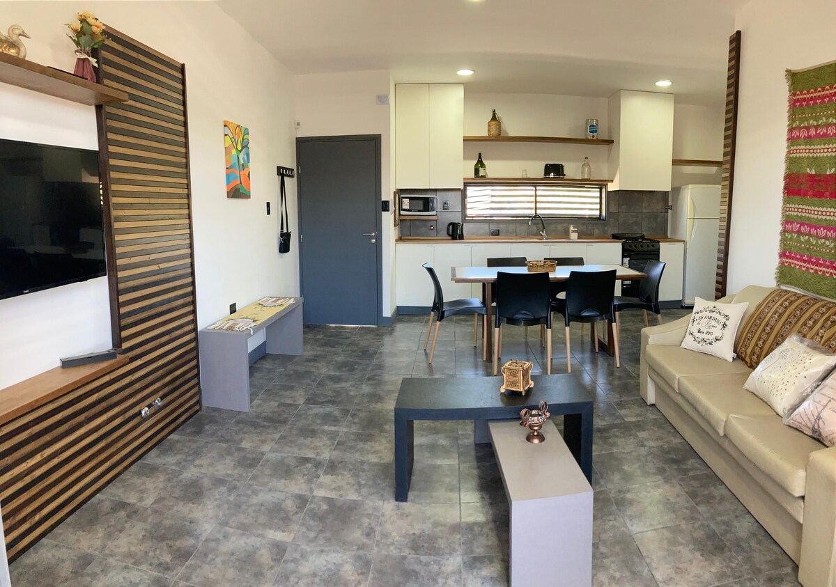 Bu ferah ve zarif konaklama yeri, dinlenmek veya çalışmak için ilimizin tadını çıkarmaya gelen aileler ve/veya insanlar için idealdir ve birçok konfora sahip sessiz, güvenli bir alanda precordillera'mızın mükemmel bir manzarasına sahip olabilirler. Süpermarketlere, eczaneye, fırına, genel olarak mağazalara yakın, Route 40 ve futbol iki yüzüncü yıl stadyumuna 5 dakika, havaalanı merkezine ve Ullum dik'e 20 dakika mesafede mükemmel bir konuma sahiptir.