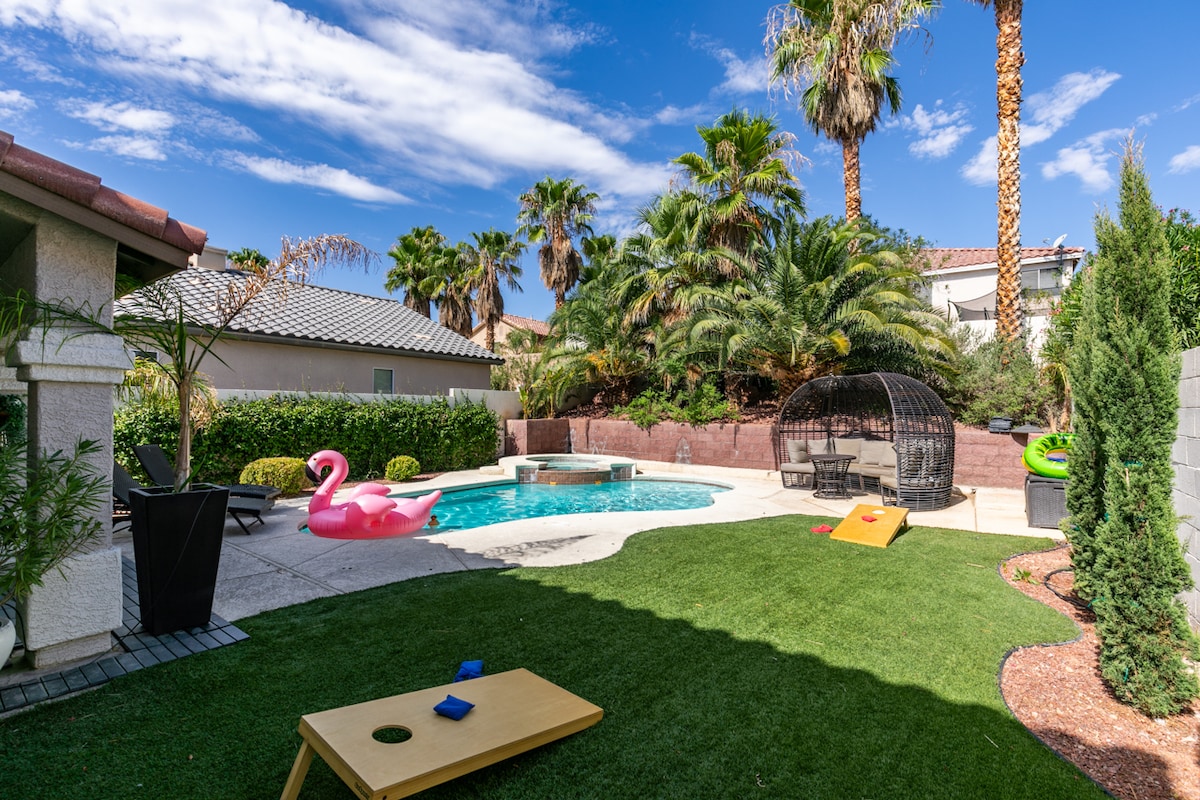 Your beautiful 1-bedroom private suite awaits, featuring a studio kitchen, private full bathroom, dining table, games, workspace, cozy living room with coffee bar. Relax in your private oasis with a beautiful backyard, big pool (3-10ft deep) and heated spa. Perfect to unwind after a thrilling day in Vegas. Suitable for a romantic getaway, family trip, or solo vacation! Book now and experience your ultimate vacation! Enjoy total privacy with a separate entry and no host interaction.