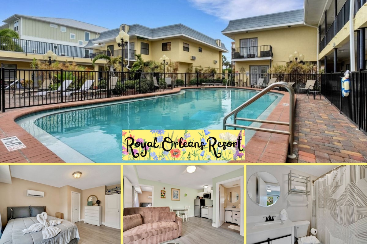 Royal Orleans 203 is a studio condo with one queen size bed that sleeps up to 2 . The condo is located on the second floor overlooking the (heated) pool . A super relaxing Gulf shore vacation that puts you just across from the beach, restaurants, and shops. In addition to the beautiful pool at Royal Orleans , you are close to golf and boating opportunities. It’s a recipe for a wonderful vacation in Redington Beach, Florida.