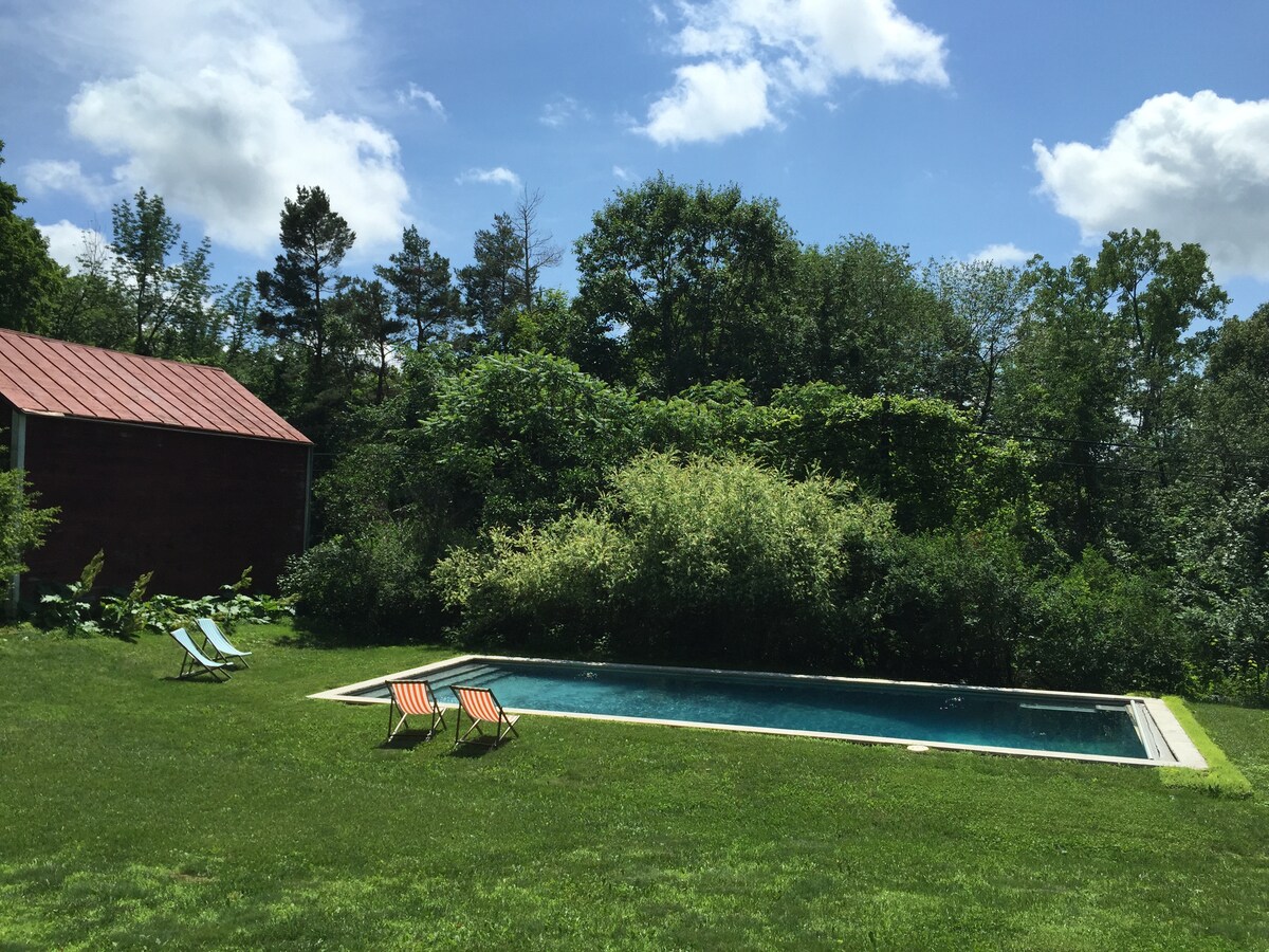 Not: Fiyatlandırmaya temizlik ve Airbnb hizmet bedelleri gibi tüm ücretler dahildir. Rezervasyon yapmadan önce sizin için ayrıntılı bilgi vermekten memnuniyet duyarım. 11 dönümlük, tarım arazileriyle çevrili sakin bir ev. Ailelerin paylaşması için mükemmel! Geniş verandada veya aydınlık, güneşli, perdeli kış bahçesinde otururken Berkshire dağlarının güzel manzarasının tadını çıkarın. Isıtmalı, 20x40 yeraltı tuzlu su havuzu. Queechy Gölü'ne üyelik dahil! Yürüyüş ve bisiklet için 5 millik düz, ağaçlık bir patika olan Corkscrew Rail patikasına yürüyün.