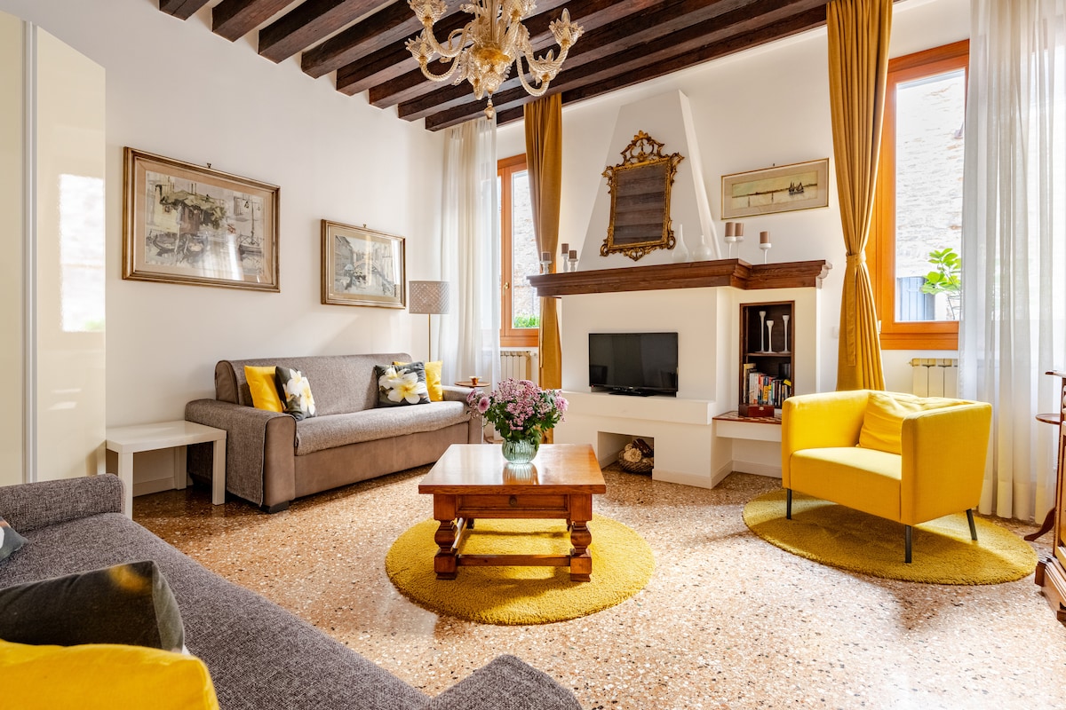 CIN NO.: IT027042C2SUIN7EP2 BAĞIMSIZ GİRİŞ! Rialto Köprüsü'ne 200 m mesafededir. Dairemiz sessiz bir sokakta tarihi bir binanın birinci katındadır (tırmanmak için sadece 22 kolay adım). Yakın zamanda modern ve işlevsel bir şekilde restore ettik ve döşedik, ancak binanın özelliklerini (kuyu, oturma odasındaki şömine ve güzel Venedik zeminleri) bıraktık. Daire ulaşıma ve havaalanına "ALILAGUNA" hattına çok yakındır.